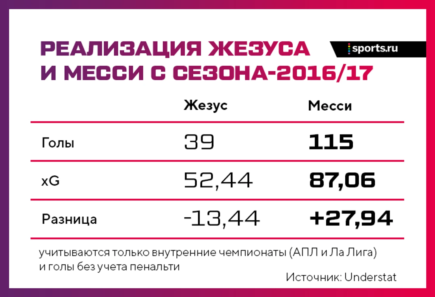 Контраст и выводы прослеживаются, даже если взять выборку последних четырех сезонов – с того момента, как Жезус приехал в Европу. За это время Габи забил на 13 мячей меньше в АПЛ, чем ожидали модели xG, Месси – на 28 больше.