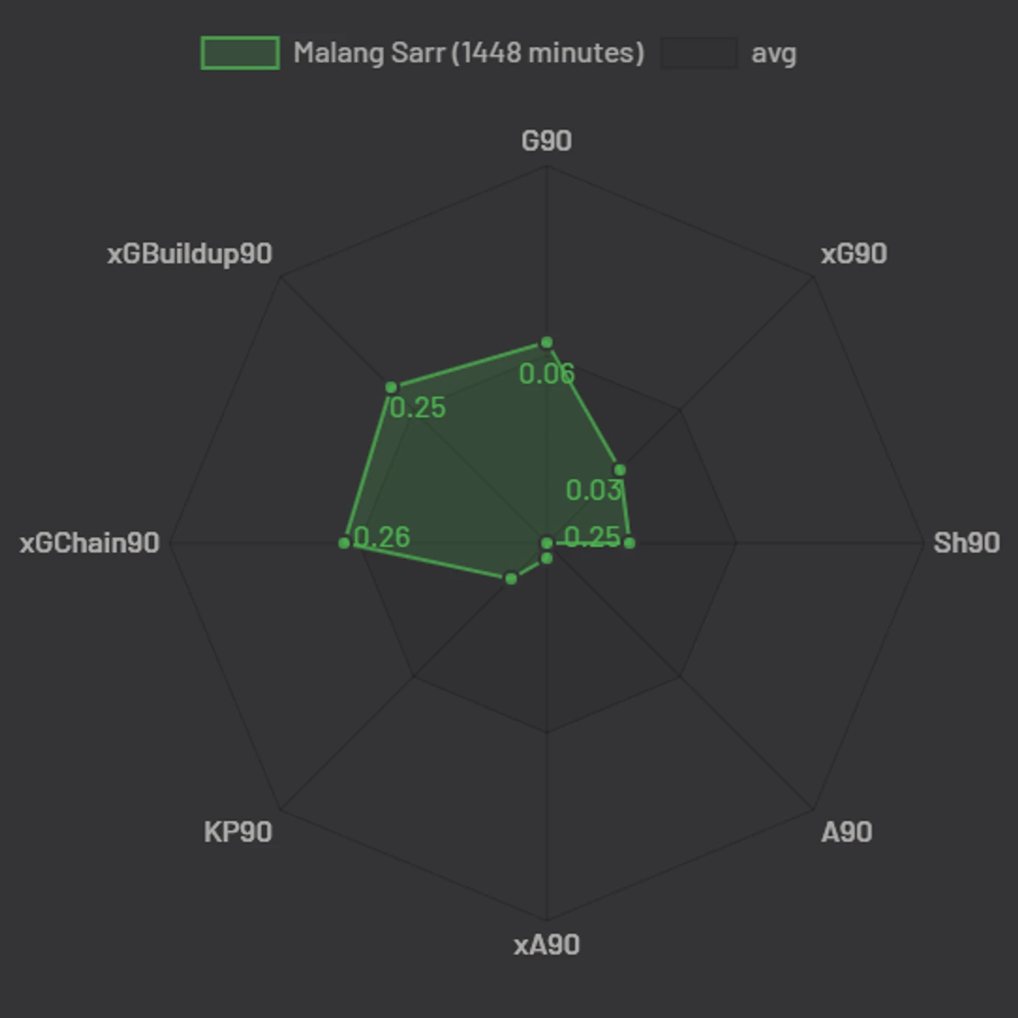 Маланг Сарр - исключительный игрок для «Челси», жертва тренеров, которые подорвали доверие одаренного игрока, заиграв его на левом фланге и лишив его важнейшего прогресса. Он имеет потенциал стать лучшим левым центральным защитником Франции. Маланг Сарр имеет более 100 профессиональных выступлений к 21 году в таком дивизионе, как Лига 1. Два года были неудачными, но если он воспользуется этими возможностями, он будет сильнее после этой несправедливости.