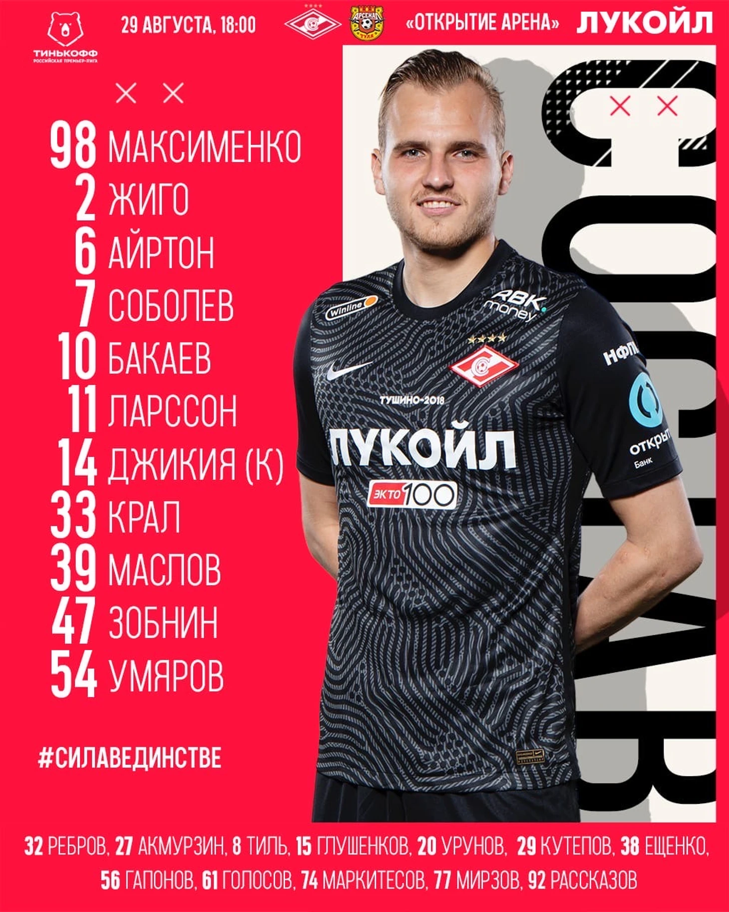 С первых минут сыграют: Максименко, Зобнин, Маслов, Джикия (к), Жиго, Айртон, Умяров, Крал, Бакаев, Ларссон, Соболев.