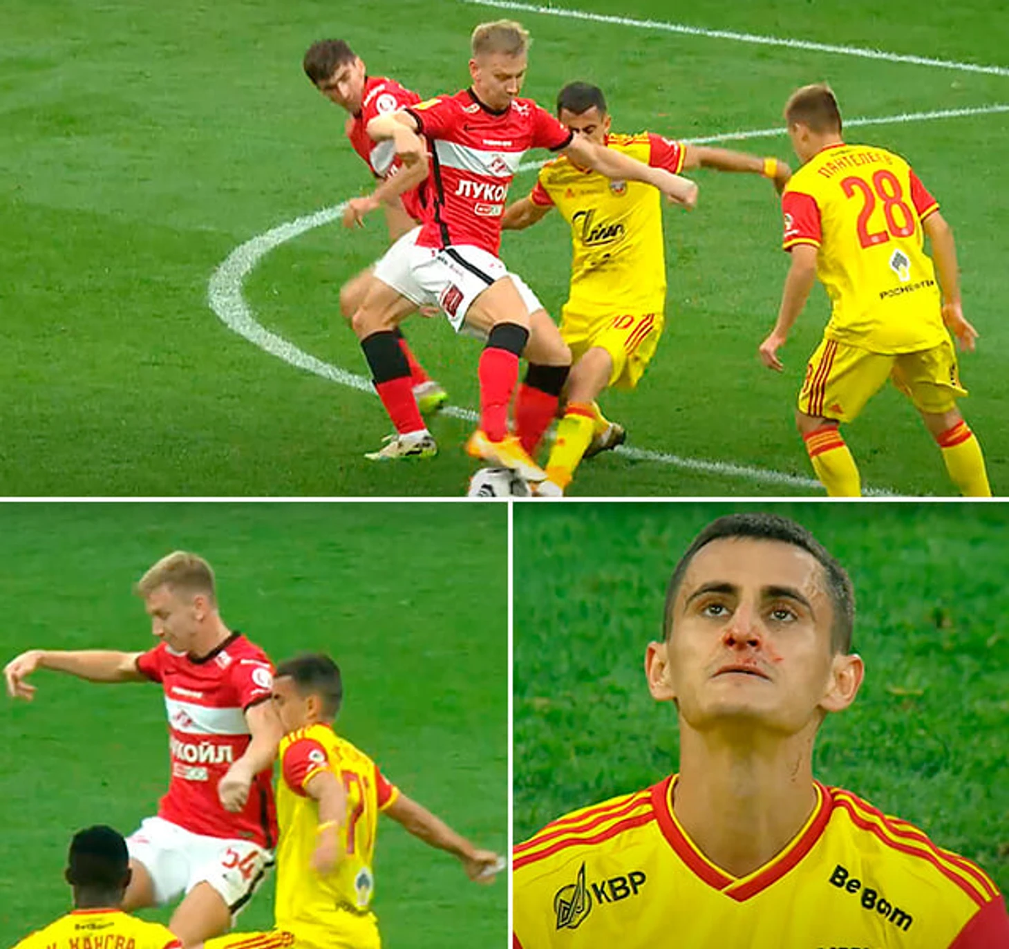 Гурам Аджоев приплюсовал еще и момент с участием Костадинова: на 15-й минуте он лежал после столкновения с Умяровым, вернулся в игру, а через двадцать минут попросил врачей снова, потому что опять пошла кровь.