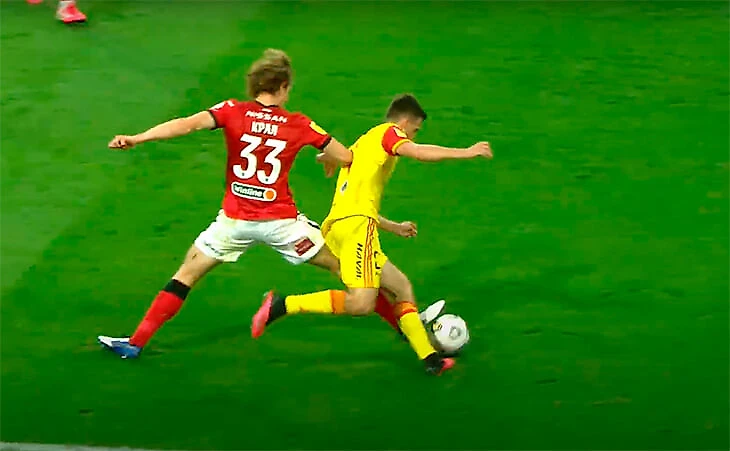 После серии финтов мяч у полузащитника рядом с лицевой выбил Алекс Крал, ассистент Антон Кобзев посчитал, что последним коснулся Лесовой – очень похоже, что это не так, и тут действительно стоило назначить угловой для «Арсенала».