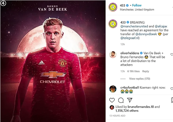 Фернандешу понравился пост от 433 в Instagram, подтверждающий соглашение между «МЮ» и «Аяксом».