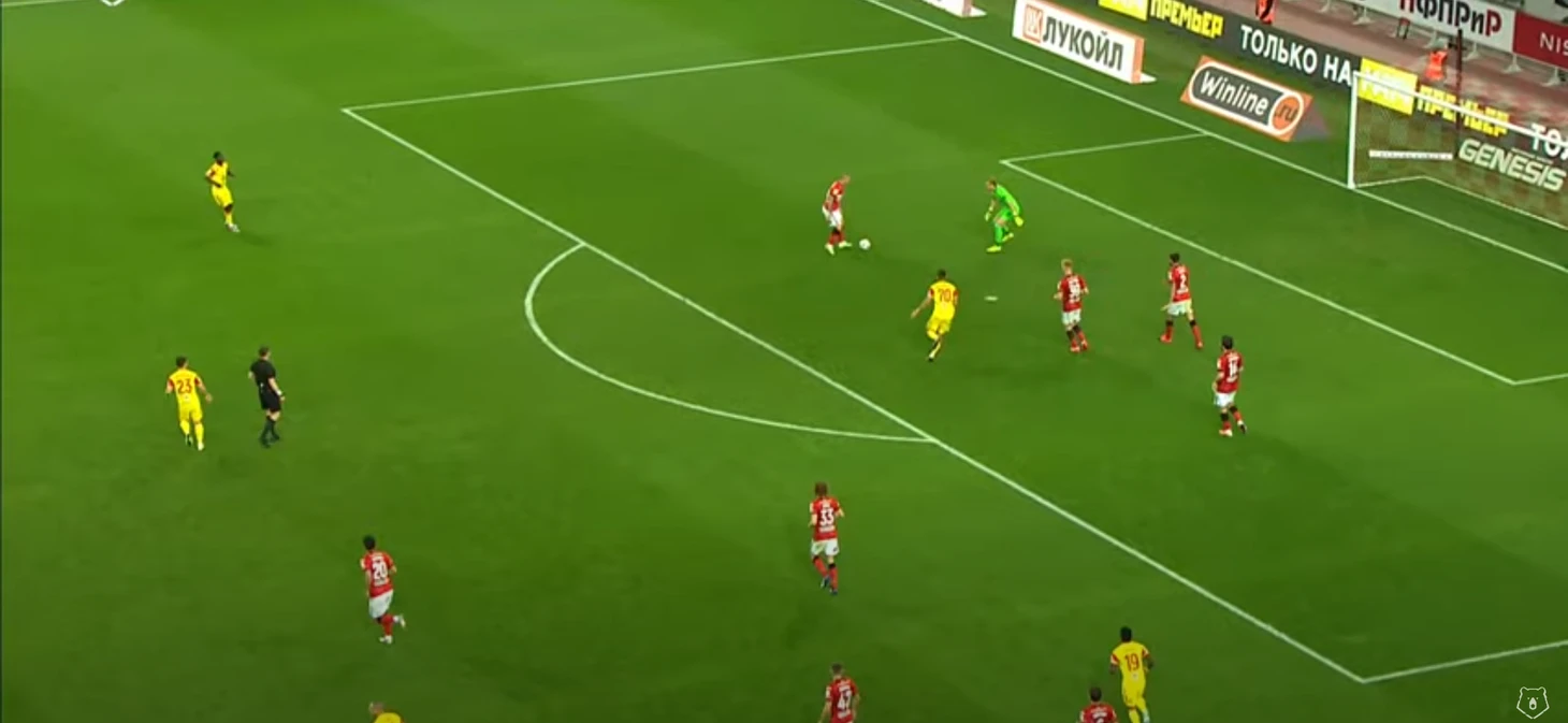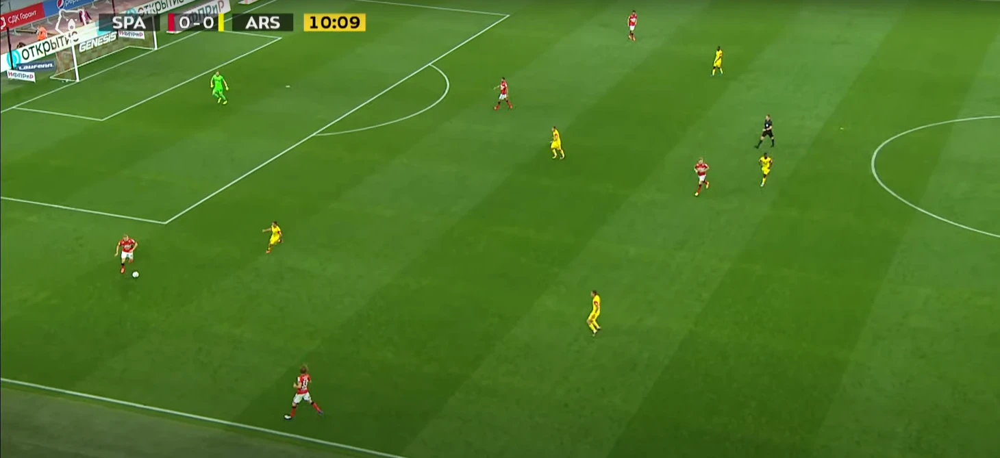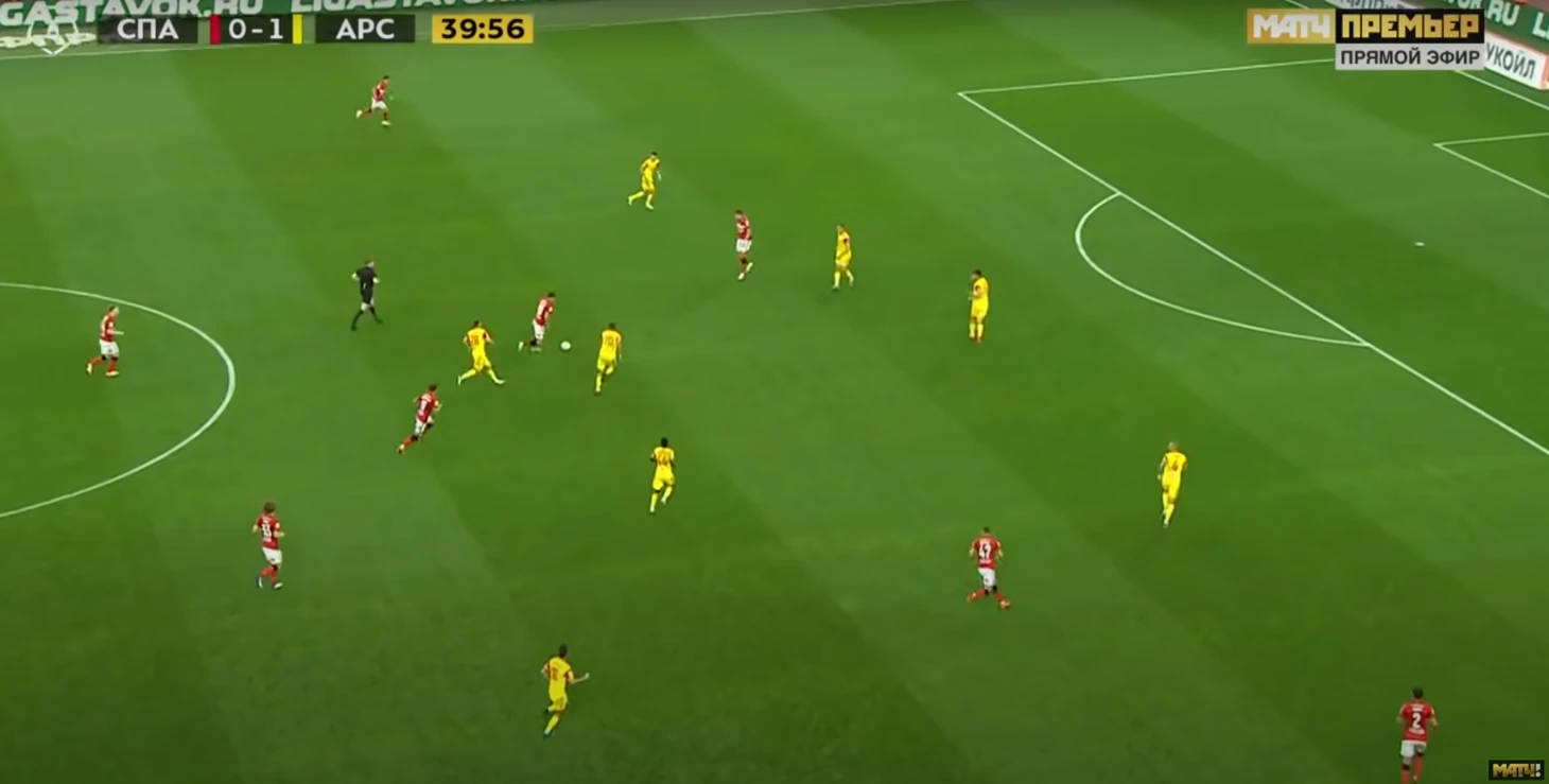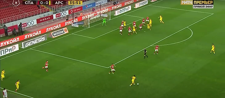 Продолжение: после серии рикошетов и обыгрыша Бауэра на встречном движении Крал еще несколько метров протаскивает мяч и отдает мяч на убегающего вперед Ларсона, который в дальнейшем входит в штрафную и делает неудачный пас на Соболева. Тут можно увидеть ошибки сразу трех игроков обороны Арсенала: Громыко – пошел в прессинг на Зобнина и был обыгран, Бауэр, который слишком легко дал обыграть себя Кралу, и Кангва, который не подстраховал своего защитника и не накрыл 33-го номера Спартака, итог – провал на левом фланге обороны.