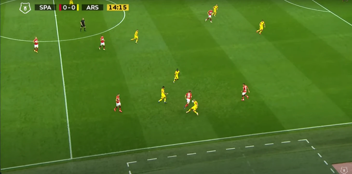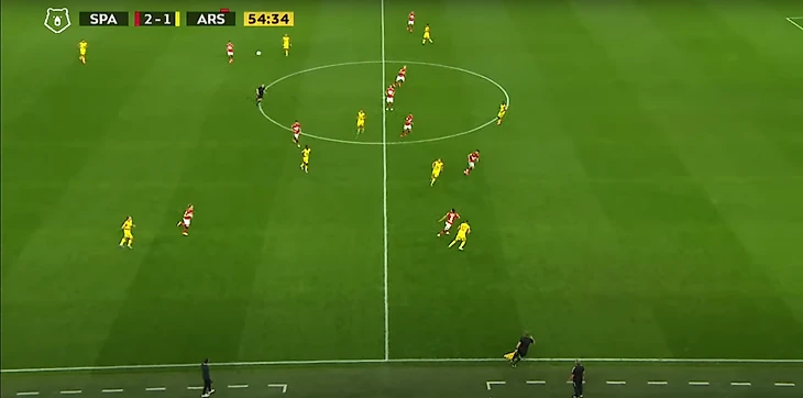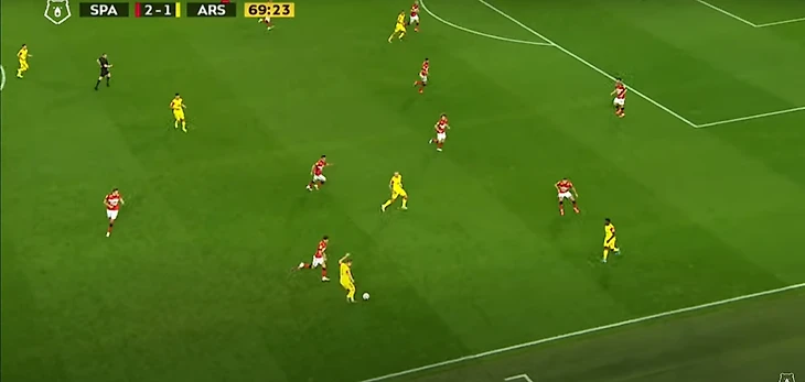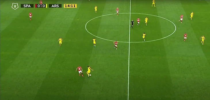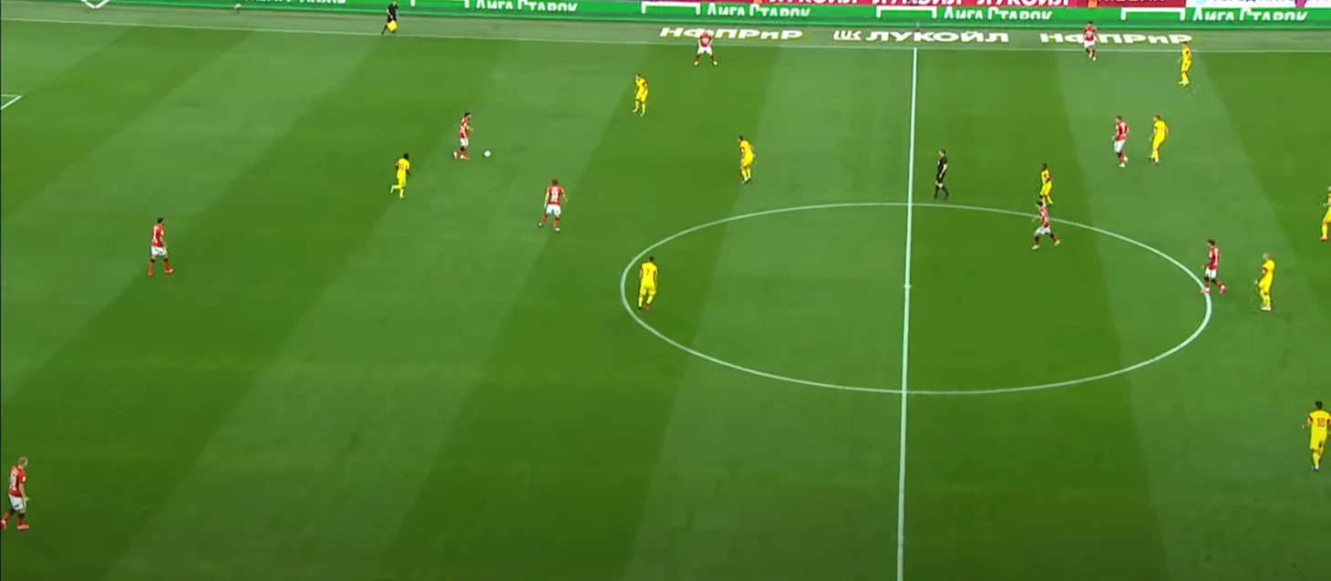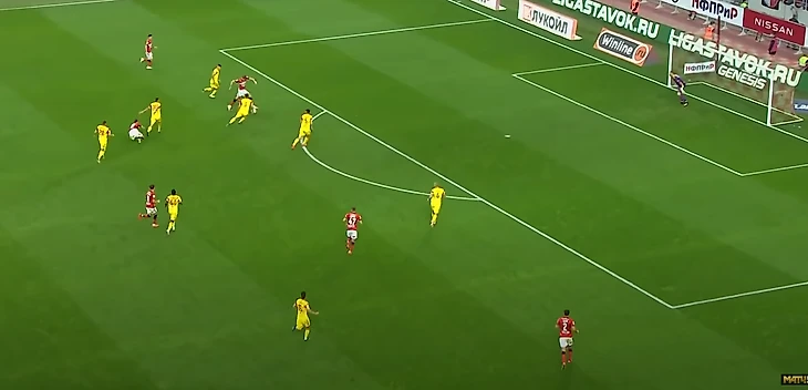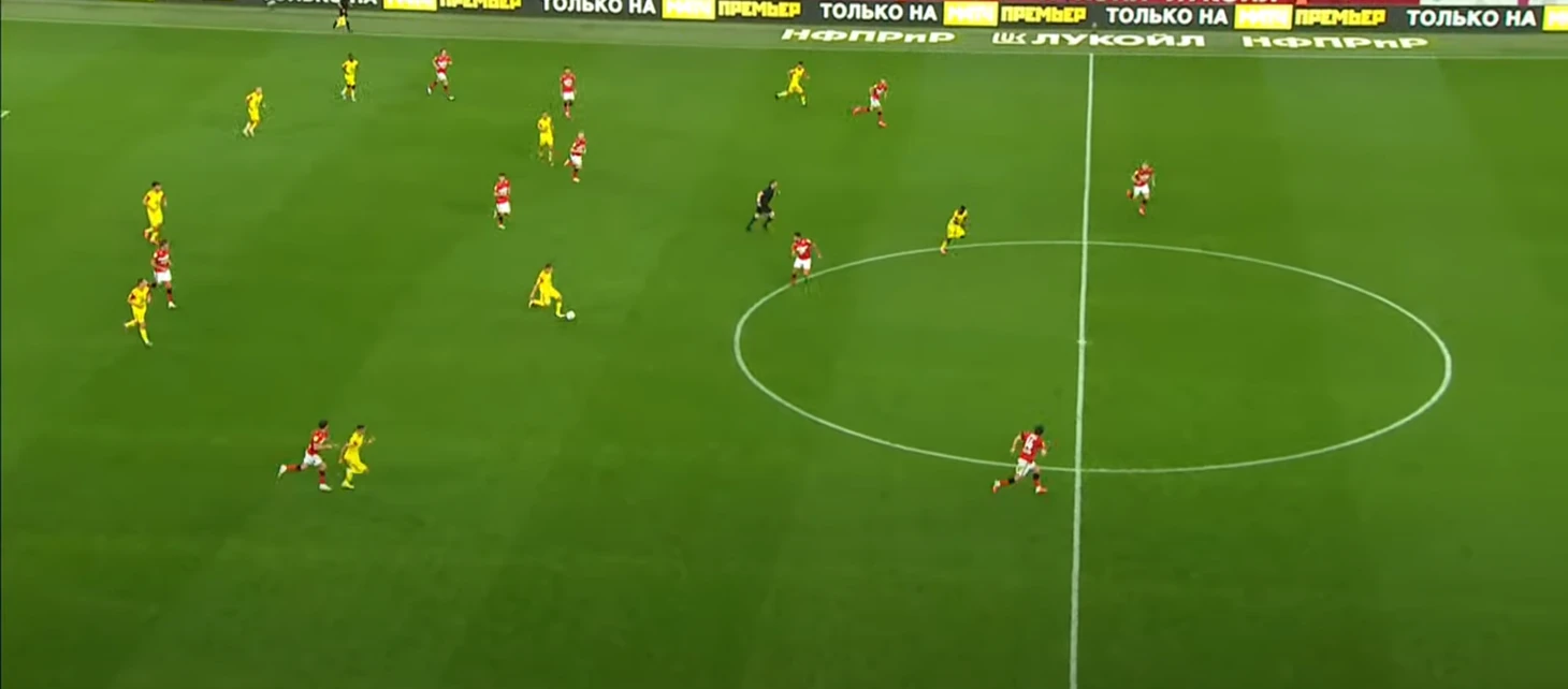 Спартак разбивал чужой прессинг при помощи уже традиционного для себя приема – опорные полузащитники уходили во фланг, с помощью этого движения освобождалось пространство в центре и на противоположном краю, а также создавалось численное преимущество на фланге.
