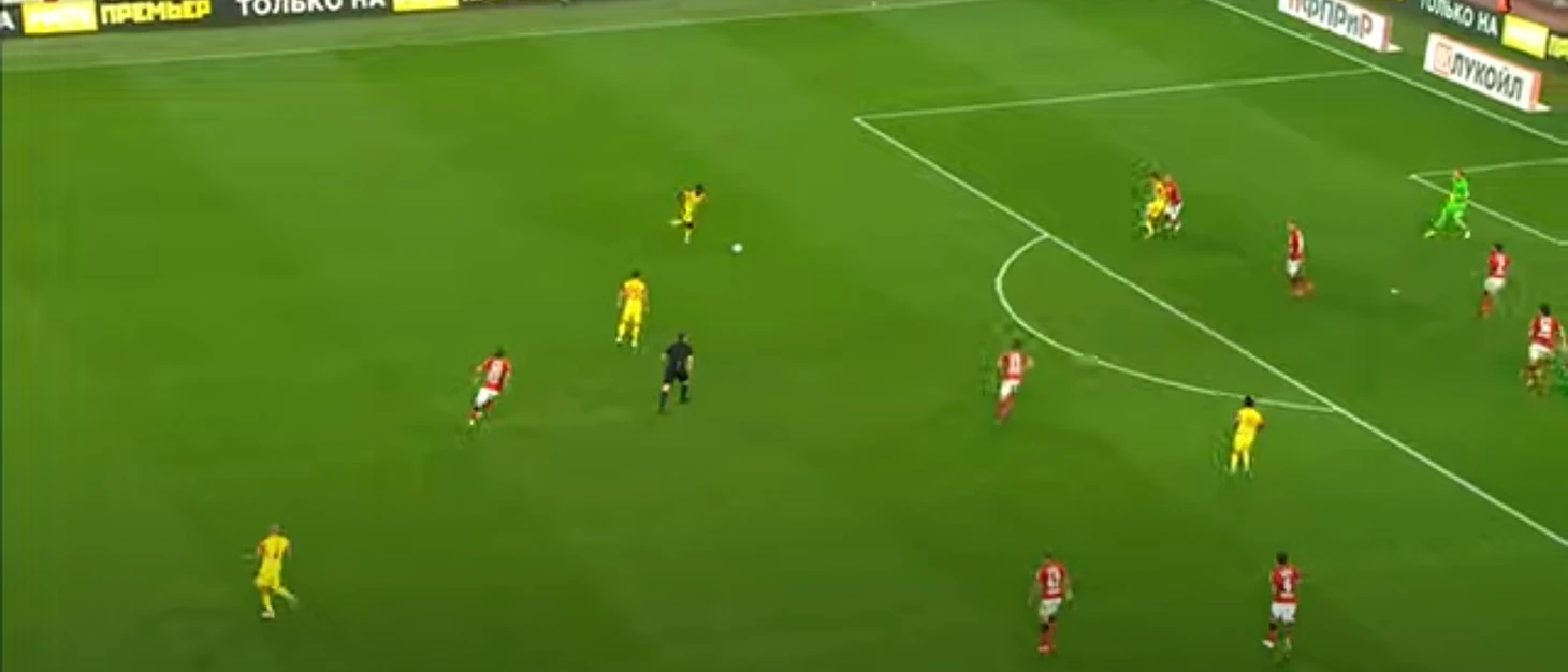 14-ая минута: Зобнин делает передачу на свободное место, куда уже из центра смещается Крал.