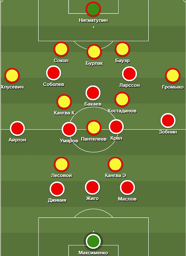 Составы. Доменико Тедеско по его собственному признанию не является сторонником сильной ротации, и поэтому состав Спартака, учитывая травму Понсе и все еще не восстановившихся Кокорина и Урунова, был достаточно легко угадываемым – Максименко в воротах, тройка ЦЗ – Джикия-Жиго-Маслов, слева – Айртон, справа – Зобнин, пара опорников – Умяров и Крал, тройка нападения – Соболев-Бакаев-Ларссон.