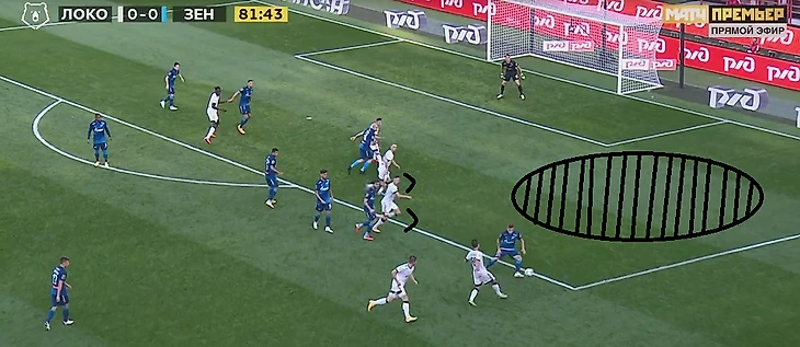 Сначала Куликов нашел свободную зону и отдал в недодачу на Игнатьева, который отклеился от защитников "Зенита".
