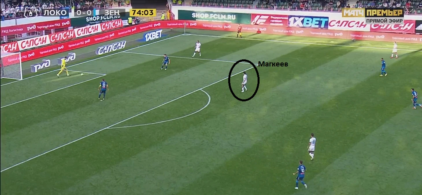 7. Если Куликов старался помогать в финальной трети, то основная задача Магкеева была начинать атаки еще на своей половине поля. Из 49 передач 25 Станислав сделал со своей половины поля. Самая запоминающаяся ситуация, при которой Магкеев получает мяч, это пас от Гильерме между двумя нападающими соперника. Как, например в этом моменте.