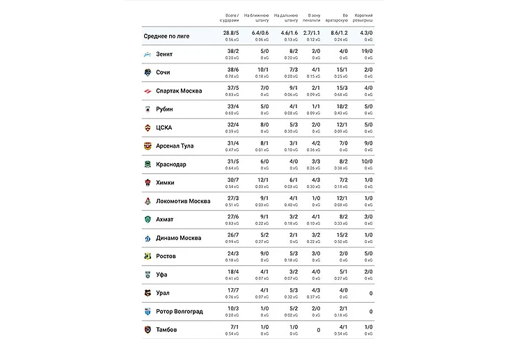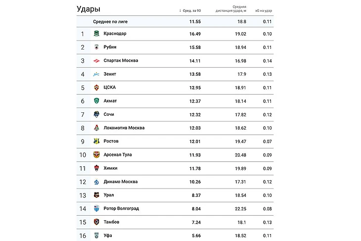 Атаку «Спартака» с положительной стороны характеризуют также показатели ударов. По среднему количеству в пересчёте на 90 минут команда Тедеско идёт третьей, зато средний вес удара у неё самый высокий в чемпионате – 0,14 на одну попытку, а средняя дистанция до ворот – самая короткая. Это говорит об опасности зон, из которых удары наносятся.