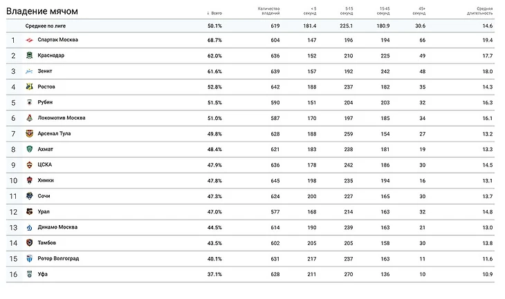 Владение мячом – показатель, который характеризует не силу команды, а скорее её стиль. У общественности возникали претензии к Тедеско как раз по стилю: многим не нравился уход в сторону контратакующего футбола и отказ от инициативы даже в матчах против аутсайдеров. Мы уже писали, что эти претензии давным-давно устарели, а в новом сезоне «Спартак» после шести туров закрепился в роли самой доминирующей команды. У красно-белых самый высокий средний процент владения (68,7%), больше всего длительных владений свыше 45 секунд и самая большая средняя длительность (19,4 секунды).