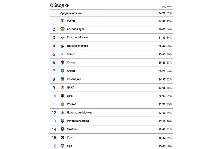 У Леонида Слуцкого в Казани собралась команда с хорошим подбором индивидуально сильных игроков и дриблёров, поэтому первое место «Рубина» в рейтинге нисколько не удивляет. Из 37 попыток обводки за 90 чуть меньше половины (15,57) – на счету Хвичи.