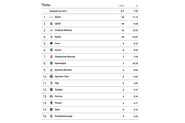 «Зенит» пропустил намного меньше всех в прошлом сезоне. В текущем чемпионате сине-бело-голубые пока не успели оторваться от соперников, но статистически они по-прежнему играют надёжнее остальных: 3,49 допущенных xG за шесть туров. Неплохие показатели и у «Динамо» (4,62), «Краснодара» (5,49) и «Спартака» (5,75). А тяжелее всех пока «Ротору», который ещё легко отделался – 9 реальных пропущенных голов против 13,67 ожидаемых.