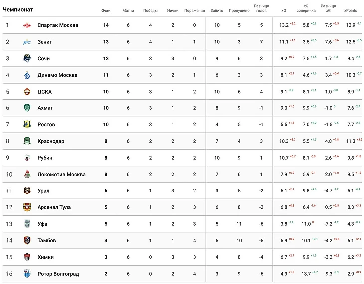 Лидерство «Спартака» подтверждается в модели xG. Команда Тедеско лучшая по ожидаемым очкам