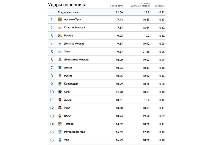 В показателях допущенных ударов «Зенит» идёт на 5-м месте, однако если вглядеться в цифры, то можно убедиться, что удары по воротам команды Сергея Семака наносятся с самых дальних расстояний и из невыгодных позиций.