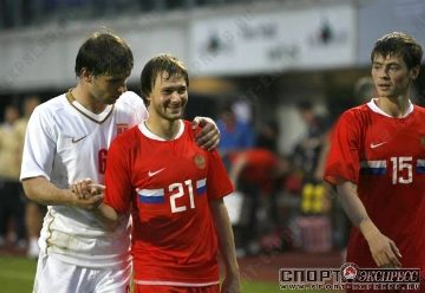 Стартовый состав сб. России: Акинфеев - Жирков, А.Березуцкий, В.Березуцкий, Анюков - Зырянов, Глушаков, Семшов - Аршавин, Кержаков, Павлюченко