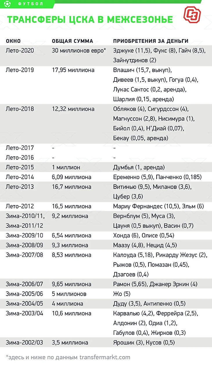 Тем не менее, даже если новичков больше не будет, 30 миллионов — это рекордная сумма, которую ЦСКА тратил за одно межсезонье. Ниже — показывающая это таблица.