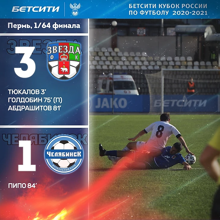 «Звезда» (Пермь) 3:1 «Челябинск» (Челябинск). Голы: Тюкалов 3', Голдобин 75' (пен.), Абдрашитов 81' — Пипо 84'. Счёт открыл Евгений Тюкалов – пермяк, начинавший в «Амкаре», затем успел поиграть в Португалии, Эстонии и Болгарии, поучаствовал в нашумевшем московском «Арарате», а сейчас снова пылит на родине. Челябинцы забили гол престижа в самом конце. Пермь в «элитном раунде»!