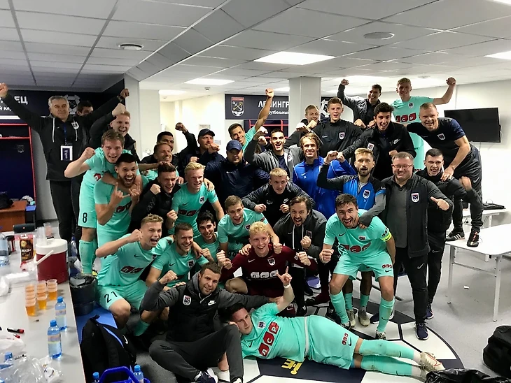 «Ленинградец» (Ленинградская область) 2:1 «Олимп-Долгопрудный» (Долгопрудный). Голы: Николаев 66', Хлусов 86' — Горбанец 8'). Клуб из Долгопрудного тренирует тот самый Ренат Билялетдинов (бывший главный тренер «Локомотива» и «Рубина»), на воротах стоит Станислав Черчесов-младший. Гости вышли вперёд благодаря голу чемпиона России в составе «Рубина» Андрея Горбанца, тем не менее, волевую победу одержали хозяева. Матч состоялся на скромном, но современном стадионе в Рощино, где во время чемпионата мира тренировалась сборная Хорватии. Вероятно, матч против команды из РПЛ на следующей стадии «Ленинградец» будет проводить на более вместительной арене. Традиционное фото из победной раздевалки: