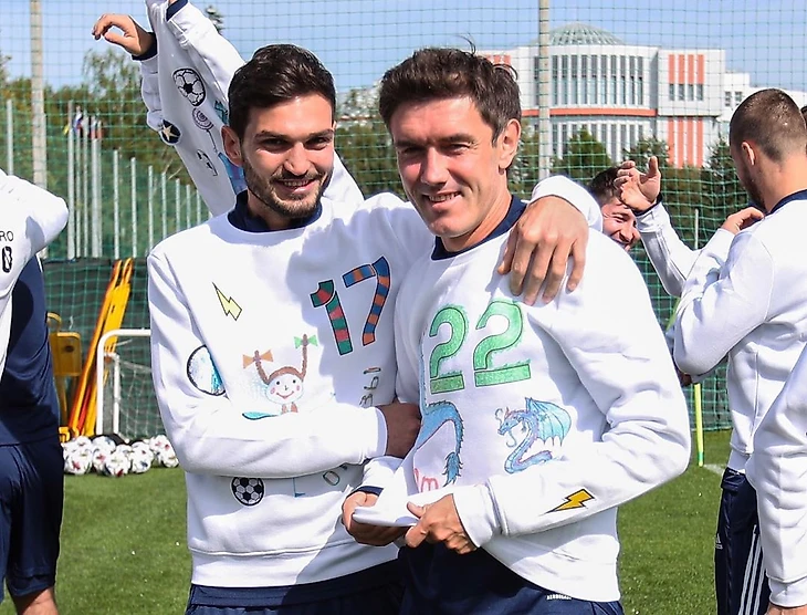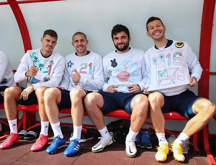 Сборная России вот-вот проведет первый матч в 2020-м – против Сербии в Лиге Наций. На последнее тренировочное занятие перед игрой футболисты вышли в необычных свитшотах. На белых кофтах – детские рисунки.