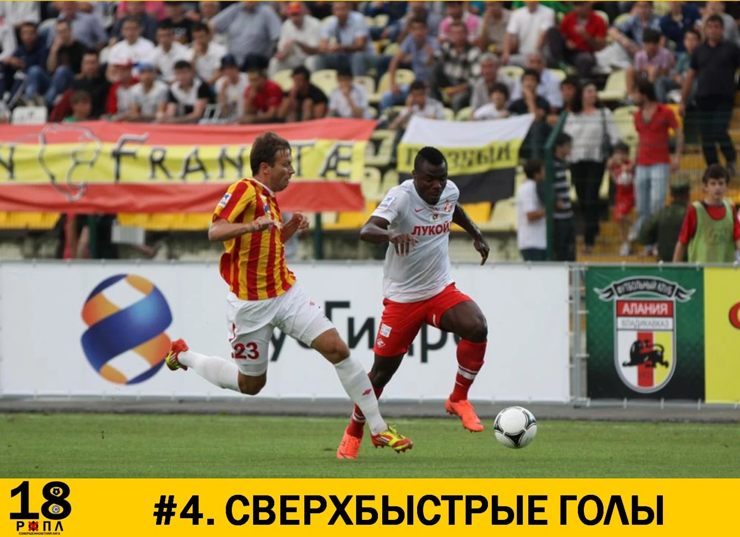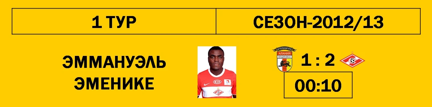 Абсолютный рекорд по быстроте забитого гола в Премьер-Лиге установил в 2012 году московский «Спартак», испортив старт сезона вернувшейся в элиту владикавказской «Алании». Пока хозяева осваивались в новой для себя обстановке, спартаковцы за 10 секунд довели мяч до чужой штрафной, где без опеки остался нигерийский форвард Эммануэль Эменике, которому хватило одного касания, чтобы поразить ворота Хомича. Игрокам «Алании» только и оставалось, что разводить руками и сигнализировать о несуществующем положении «вне игры». Так спартаковцы отметили дебют Унаи Эмери на тренерском мостике «красно-белых». Первые 10 секунд испанца в России получились по-настоящему сказочными.