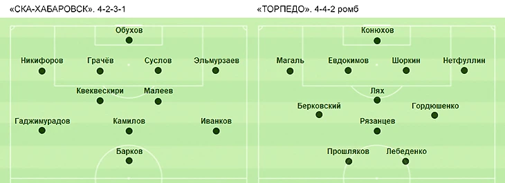- «Торпедо» прибавляло и прибавляло, а футболисты хозяев стали уставать. Неудачно ударившегося о газон еще в первом тайме центрального защитника Грачёва пришлось менять на Труфанова. Набегавшегося автора двух голов Баркова заменил Базелюк. Пошел ва-банк Сергей Игнашевич, сняв опорника Ляха и заменив его на атакующего игрока – Константина Кертанова. Тот отправился в вершину торпедовского ромба, нацеленную на ворота «СКА-Хабаровска», а Рязанцев ушел с нее на позицию опорного хавбека. Еще одну замену из-за усталости пришлось делать тренеру хозяев Алексею Поддубскому – Никифорова заменил Мануйлов.