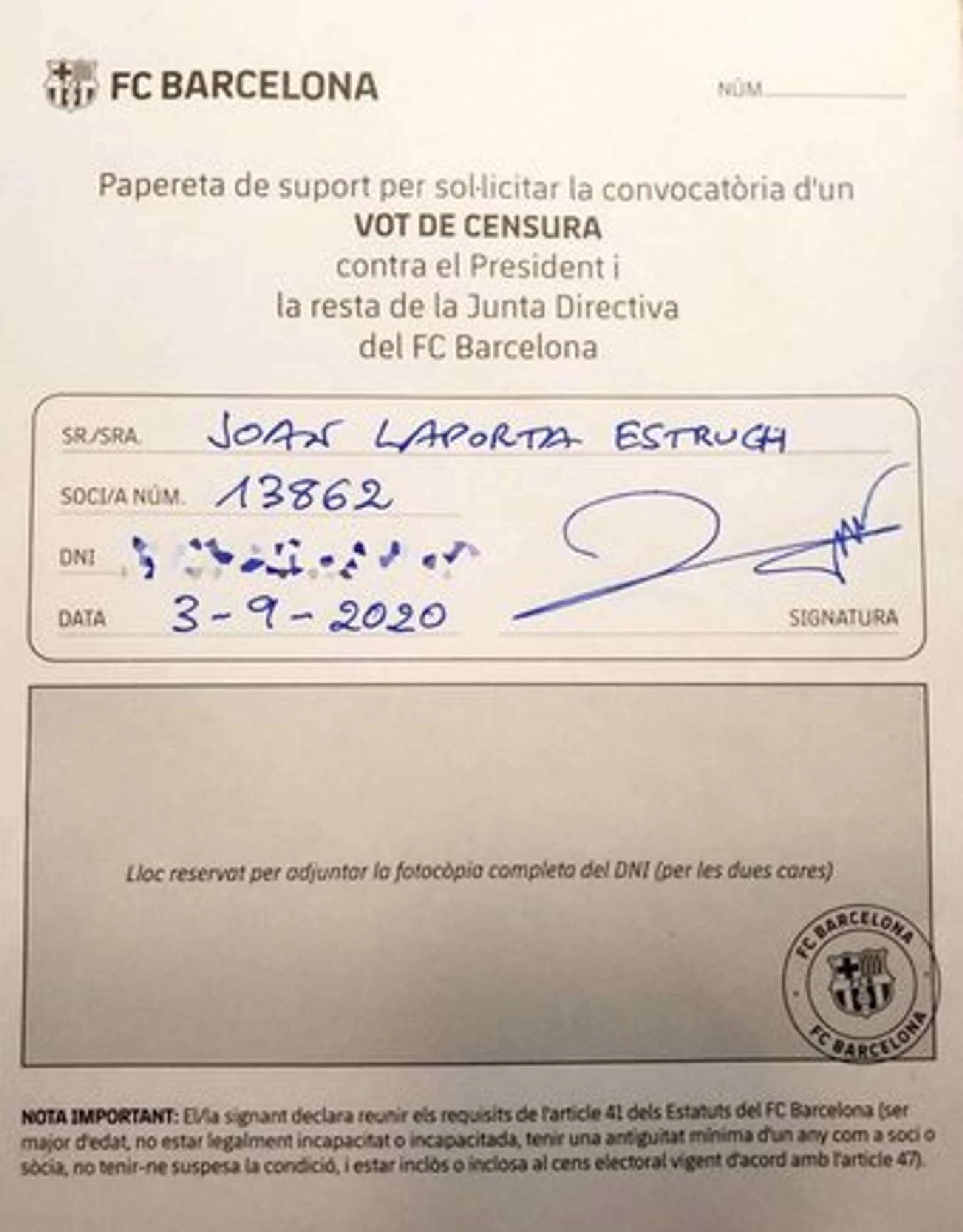 Sport передает: инициатива по вынесению вотума недоверия против нынешней хунты «Барселоны», возглавляемой Жозепом Бартомеу, нашла особую поддержку в субботу [в тот день было объявлено о событии, произошедшем двумя днями ранее]. Сосьо №13 862 поставил свою подпись под вотумом. Это номер бывшего президента клуба Жоана Лапорты.