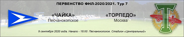 «ЧАЙКА» Песчанокопское – «ТОРПЕДО» Москва Судьи: Евгений Буланов (Саранск), Фёдор Валявин (Саратов), Алексей Линкин (Воронеж). Инспектор: Олег Лонский (Смоленск). Делегат: Алексей Алексеев (Санкт-Петербург). 9 сентября 2020 года. Начало – 18:00. Песчанокопское. Стадион: «Центральный» имени И.П.Чайка.