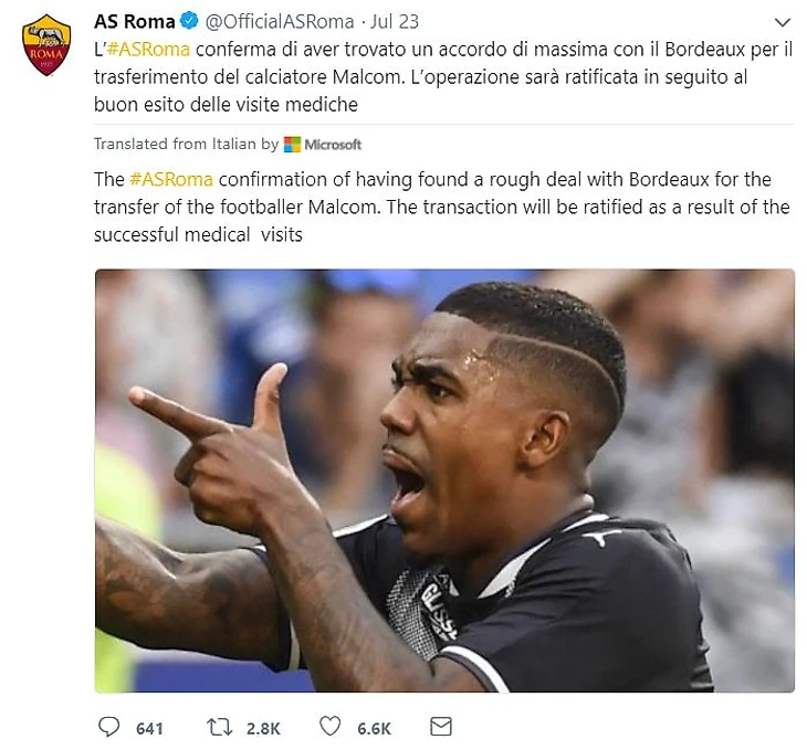 23 июля 2018 французский клуб Малкома «Бордо» и «Рома» официально объявили, что договорились о переходе бразильца. Однако спустя несколько часов ситуация перевернулась.