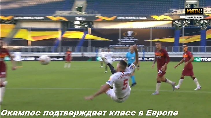 У «Севильи» с «Ромой» не было предусмотрено ответной игры, поскольку они не успели сыграть первый матч до коронапаузы. А потому им предстояло выяснить все в одном матче на нейтральном поле. Испанцам хватило одного тайма, чтобы дать понять, кто есть кто в этот вечер. Прекрасный гол после сольного прохода забил Регилон. А второй мяч сделал как раз Окампос. Эн-Несири оставалось только подставить ногу.