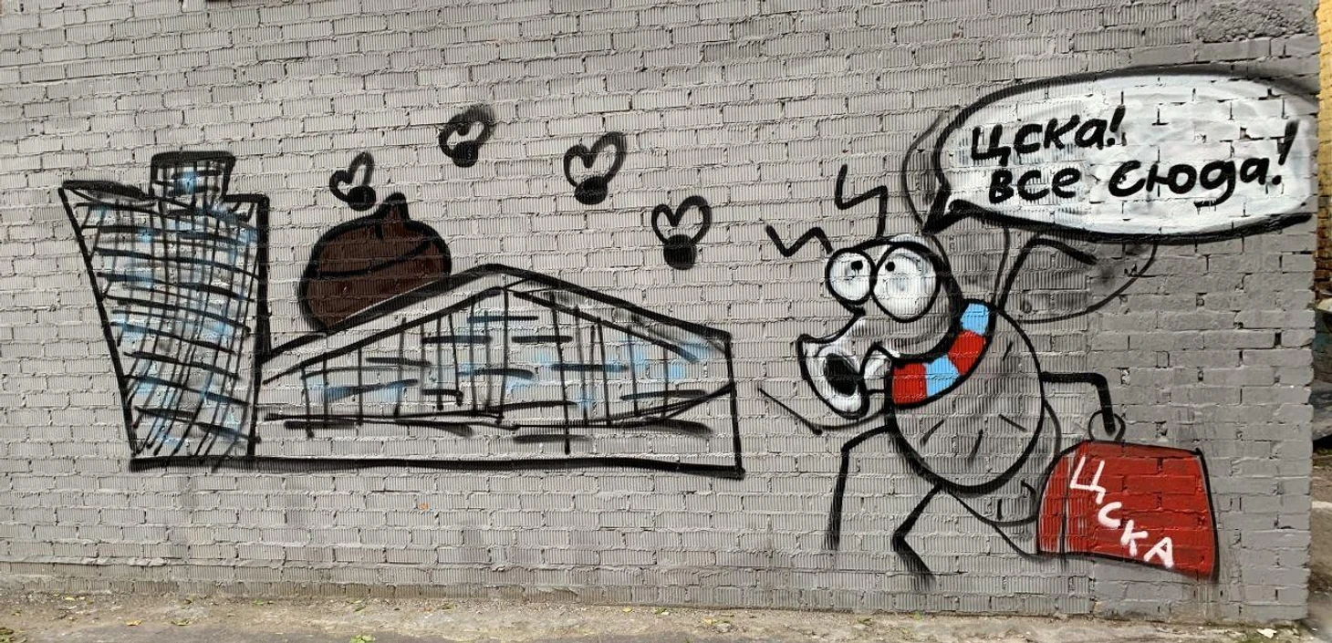 На этом граффити обыгрывается прозвище стадиона ЦСКА - болельщики Спартака называют его "унитаз-ареной". Отсюда и муха на рисунке: