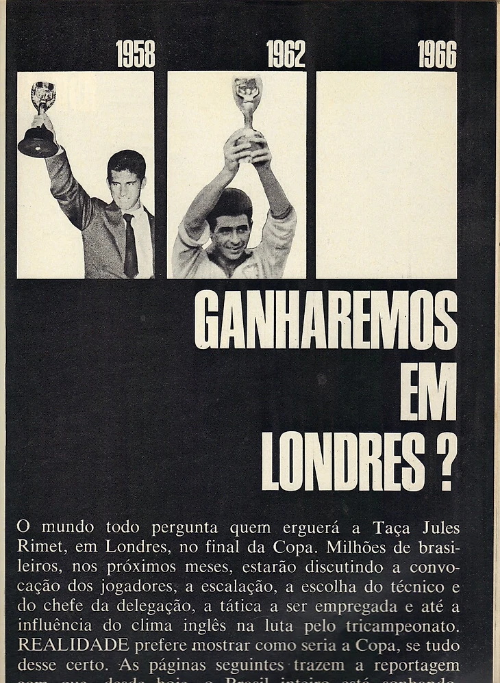 В январе 1966 года вице-президент бразильской Конфедерации футбола Силвио Пашеко, вручая золотую Нику президенту английской футбольной ассоциации Джо Мирсу, хвастливо заявил: «Подержите ее у себя полгода, а потом мы ее у вас заберем себе на вечное хранение». Пеле в автобиографии тоже пишет о карнавальном настроении, которое охватило всю страну: «Во время подготовки к чемпионату мира 1966 года, мы по-прежнему жили победами 1958 и 1962. Все болельщики, журналисты, менеджеры и даже футболисты не сомневались в третьем подряд успехе. Не было такого человека, которого бы обошел стороной этот преувеличенный оптимизм, – об этом говорила вся страна. Все были уверены, что мы с легкостью победим. Однако по мере того, как приближалось начало чемпионата мира, наша уверенность начала таять на глазах».