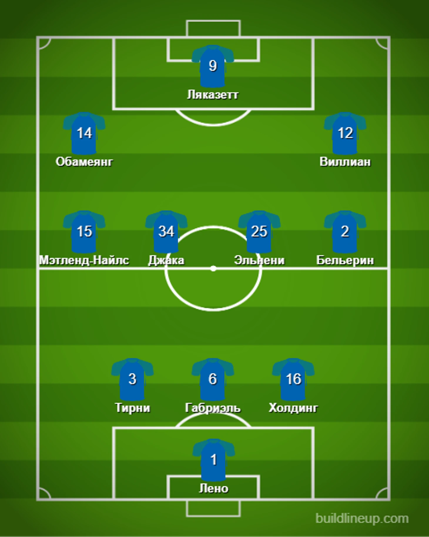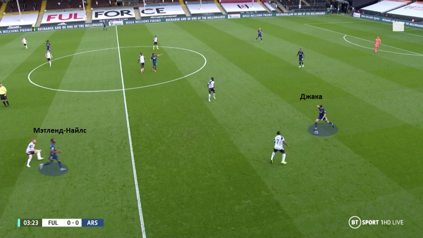 Когда Джака оттягивался глубже, Мэйтленд-Найлс перемещался в центральную зону на место Гранита. Такие перемещения с взаимозаменяемостью внесли сумятицу в оборонительные ряды «Фулхэма». Они теряли позиции, из-за этого появлялось много свободного пространства для того же Обамеянга, который оставался один в один с защитником. В том числе, возникали опасные моменты, после длинных передач Джаки на Пьера-Эмерика.