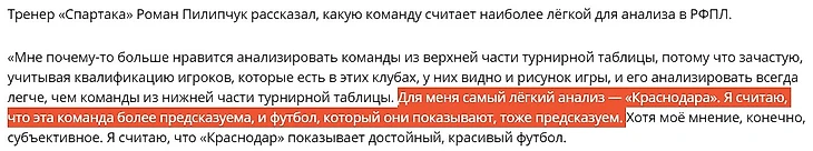 Прошло несколько лет, и теперь эта характеристика точно также применима к нам. Спартак стал предсказуем. Составом, тактикой, заменами и ужасом в глазах Маслова при приеме мяча. В общем, вчера расстроили абсолютно все. И тренер (смотри выше), и игроки, и Газизов. Макси, как же так? Классные вратари не имеют права такое пускать. Джикия с Жиго на двоих выполнили план Санто Моцарта по передачам поперек и назад. Маслов, на мой взгляд, ментально не готов играть в команде, которая борется за высокие места. Крал энд Умяров серенько. А из под Наиля еще и угловой приехал. Рома, Понсе и Ларссон - хороший матч. Расстроил и Шамиль, цена слов которого уменьшается на глазах. Риторика первых дней, признаться, была иной. Обещал игроков к первому сбору. На дворе 8-й тур проблемные позиции не закрыты.