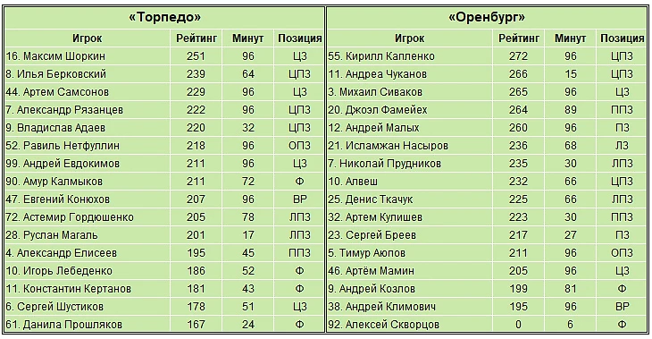 «Торпедо» - «Оренбург»: рейтинг футболистов от спортивного аналитического агентства InStat