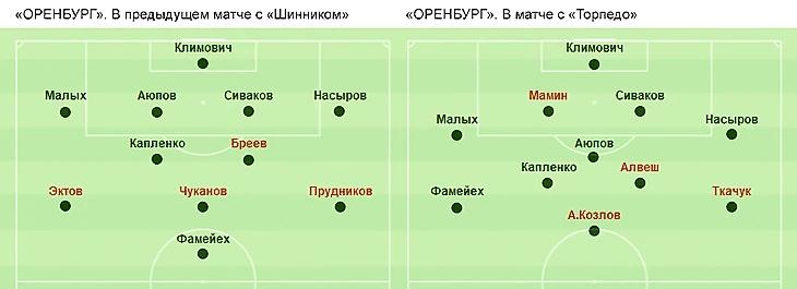 У «Оренбурга» не оказалось даже в запасе флангового хавбека Александра Эктова. В предыдущем матче его заменили на 67-й минуте. Возможно, рыжеволосый полузащитник получил травму. По причине ротации или тренерского решения отсутствовали в старте южноуральцев опорный хавбек Сергей Бреев, левый полузащитник Николай Прудников и атакующий полузащитник Андреа Чуканов. А сама схема с 4-2-3-1 поменялась на атакующий вариант 4-1-4-1 - с действующими выше обычного крайними хавбеками (практически в роли нападающих) и крайними защитниками (практически в роли хавбеков). Его же в принципе часто описывают формулой 4-3-3.