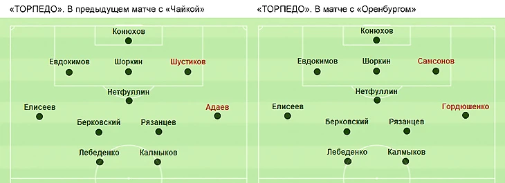 - «Торпедо» выпустило на левую бровку вместо уставшего Гордюшенко Руслана Магаля. А у «Оренбурга» наборовшегося в воздухе и «наполучавшего тумаков» Андрея Козлова заменил Андреа Чуканов.
