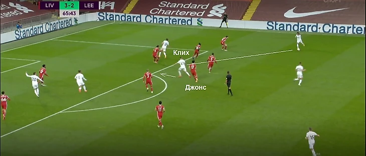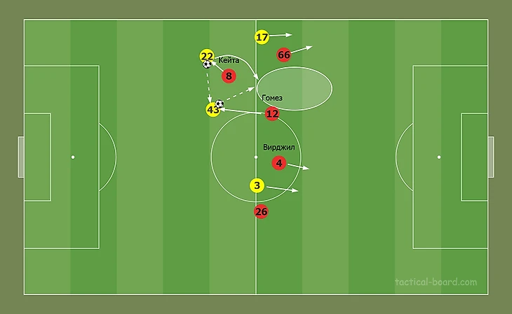 Второй гол «Лидса». Обычная игра в стеночку, за счет которой Кейта остается отыгранным. Гомез выдергивается на игрока, на которого идет пас, оставляя при этом за спиной свободное пространство. Отыгрыш в стенку обратно на Харрисона, и он уже вбегает в открытую зону, а Кейта стоит на месте и даже не пытается следовать за оппонентом. Никакой подстраховки для Гомеза. Дальше уже последовала ошибка ван Дейка.