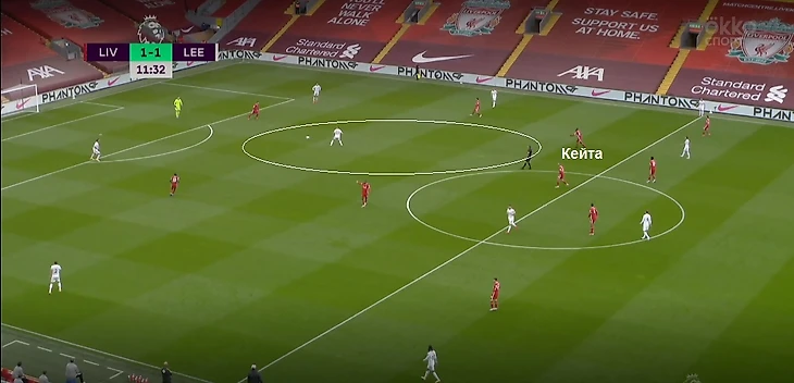 Хочется отметить игру Кейта. Складывается ощущение, что игрок все еще не понимает как ему нужно играть в этой команде, и все еще адаптируется, хотя прошло уже довольно много времени с момента его перехода в «Ливерпуль». Вспомним первый гол «Лидса», а вернее с чего он начался. Кейта почему то оставил опорника «павлинов» без внимания, и тот был совершенно открыт для передачи в свободном пространстве без давления. В итоге, он принял мяч, спокойно развернулся, оценил ситуацию, так как было время, и сделал заброс на левый фланг, откуда уже пошла голевая атака на ворота «Ливерпуля». Находись Кейта ближе к игроку, успел бы оказать на него давление, и возможно, пас у опорника не получился бы.