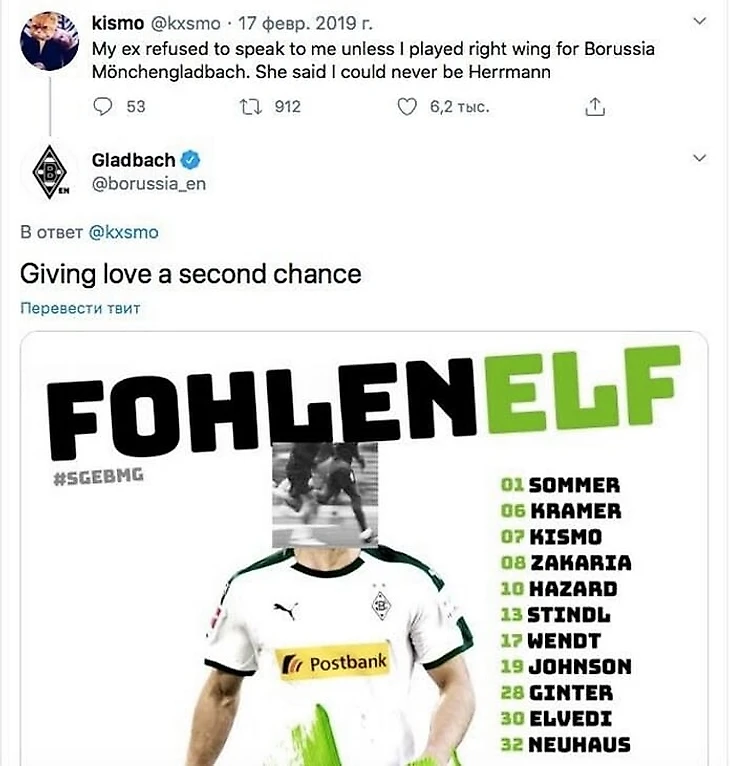 В начале прошлого года молодой человек с никнеймом Kismo пожаловался в твиттере, что его девушка отказывается разговаривать с ним до тех пор, пока он не сыграет за «Гладбах» на правом фланге. В комментарии к нему пришли SMM-щики клуба и запостили традиционную афишу на ближайший матч против «Айнтрахта», где под номером Патрика Херманна (правого вингера) был записан Kismo, а вместо лица футболиста «Боруссии» прикрепили юзерпик. Позже клуб прислал молодому человеку подписанную футболку Херманна на память.