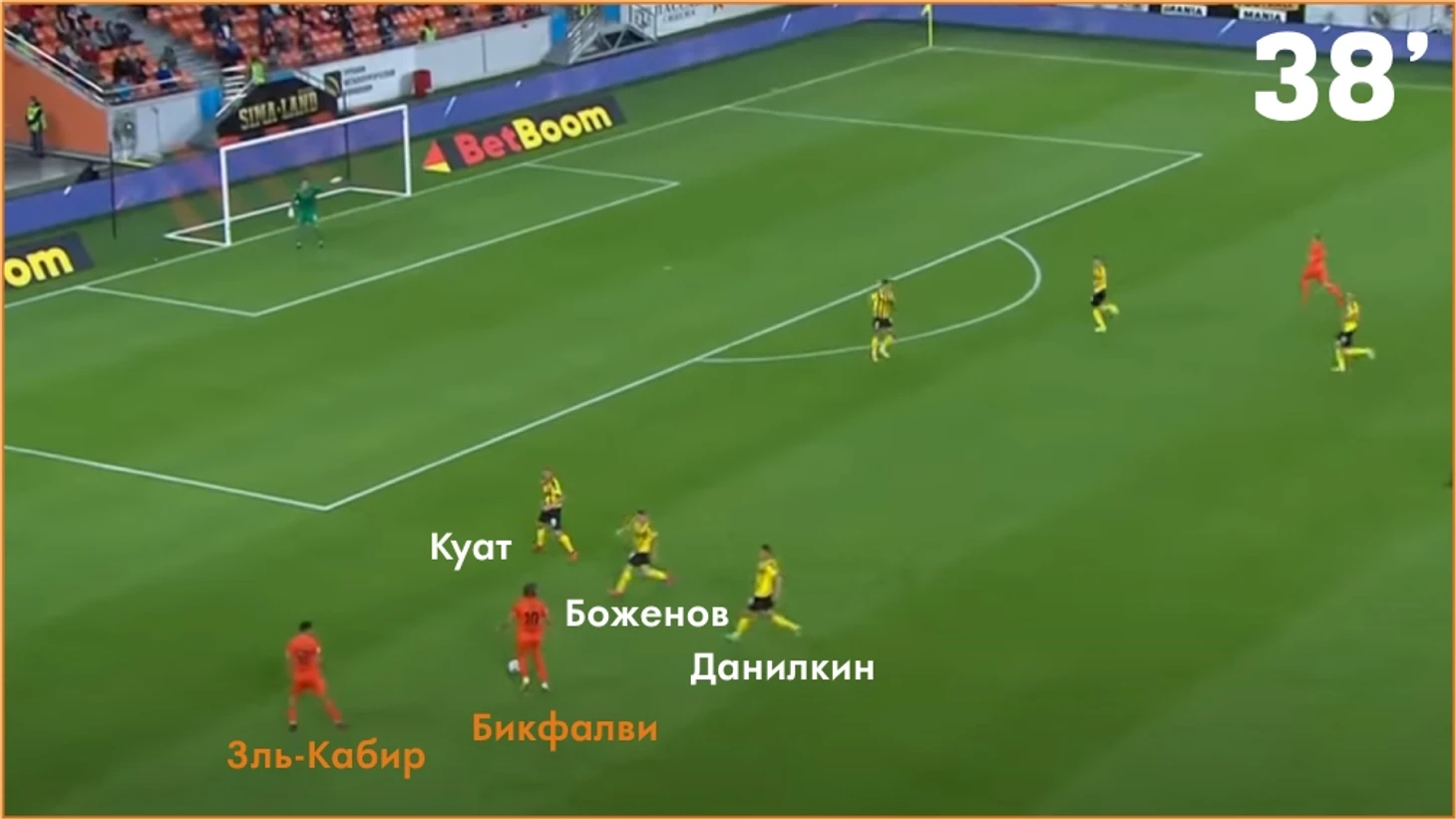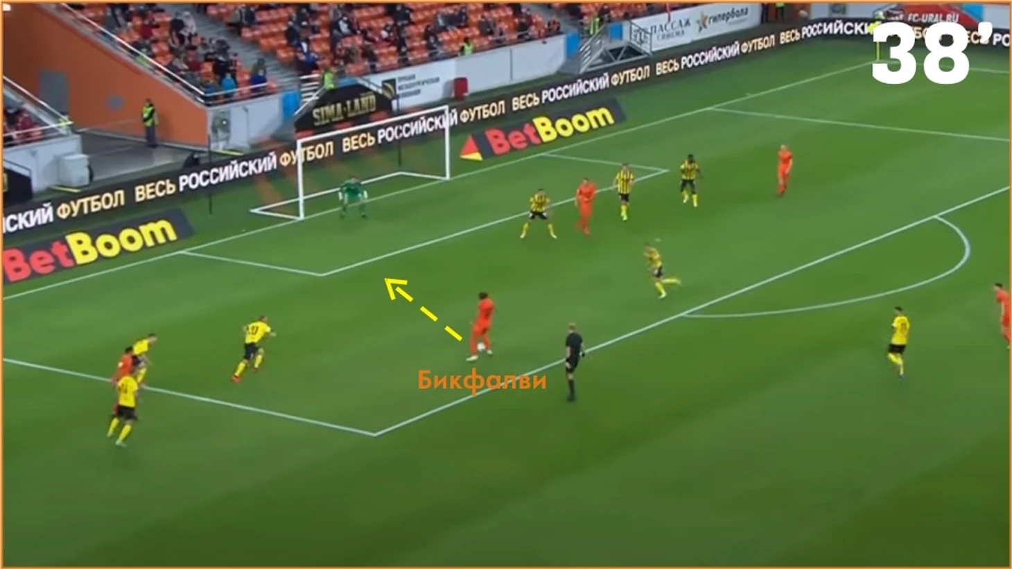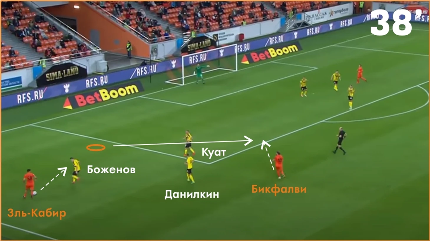 Эль-Кабир весь матч смело шёл в обводку, если его встречал молодой Боженов, которому 19. И сейчас марокканец дошёл до штрафной и настолько напугал всю троицу защитников, что те бросились закрывать проход, забыв о Бикфалви. Эль-Кабир, стянув оборону, отдаёт мяч.