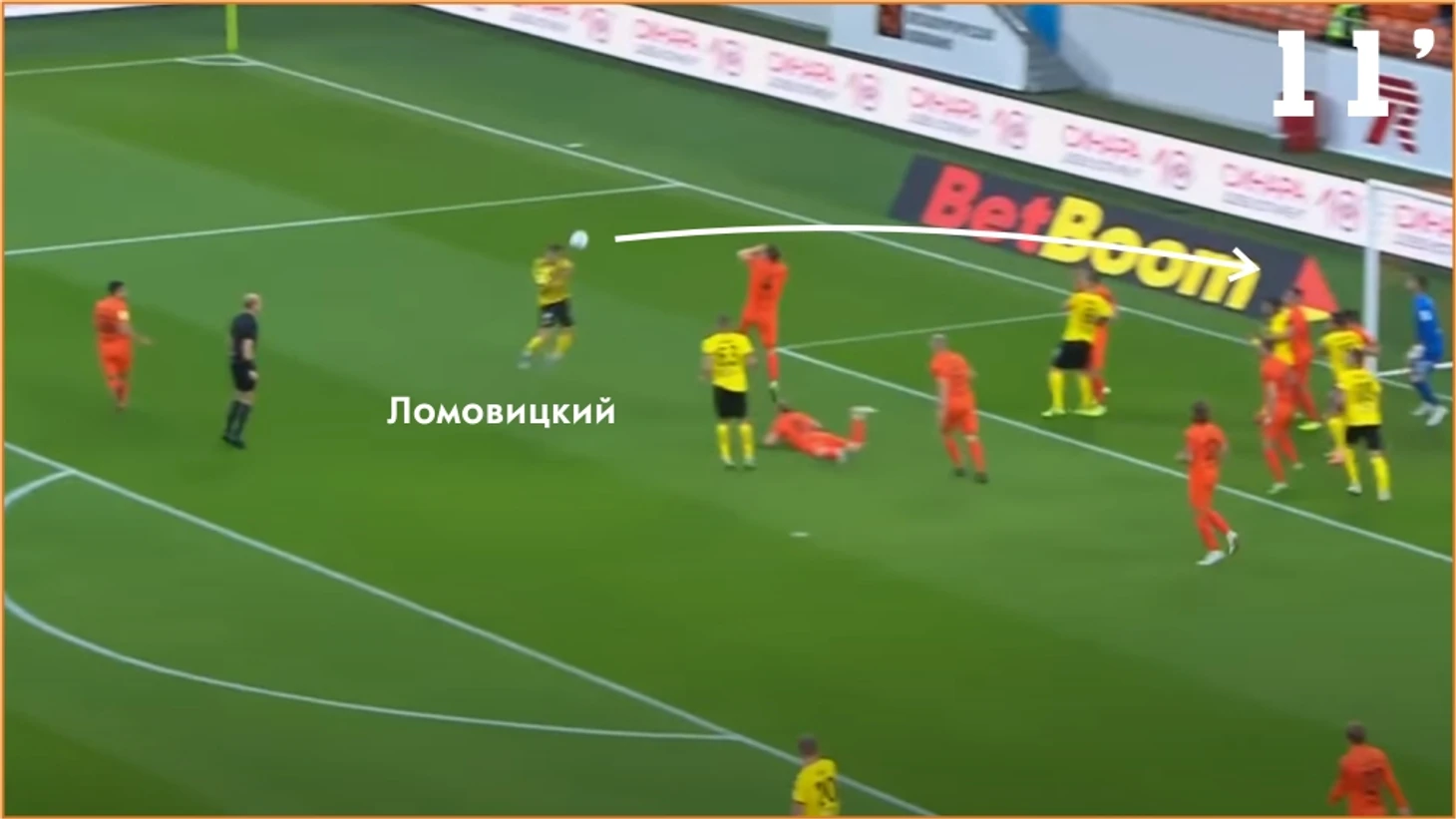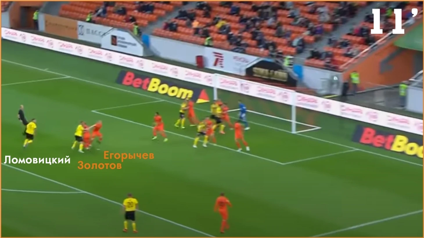 Ближе к делу. Мяч с углового идёт прямиком к одинокому Ломовицкому. Почему же он один? А потому, что Золотов заблокировался другим игроком "Химок" и потерял своего.