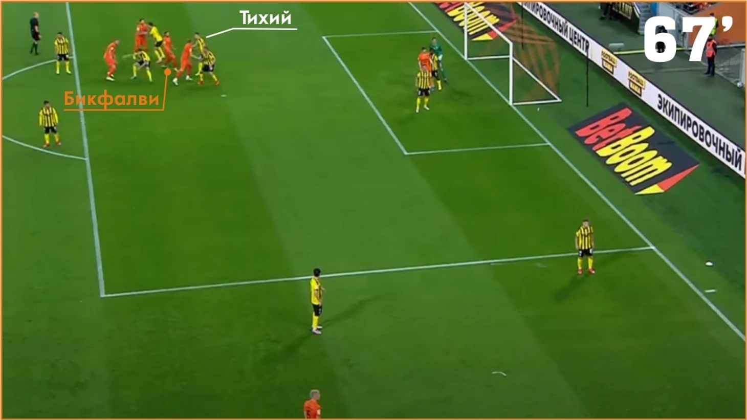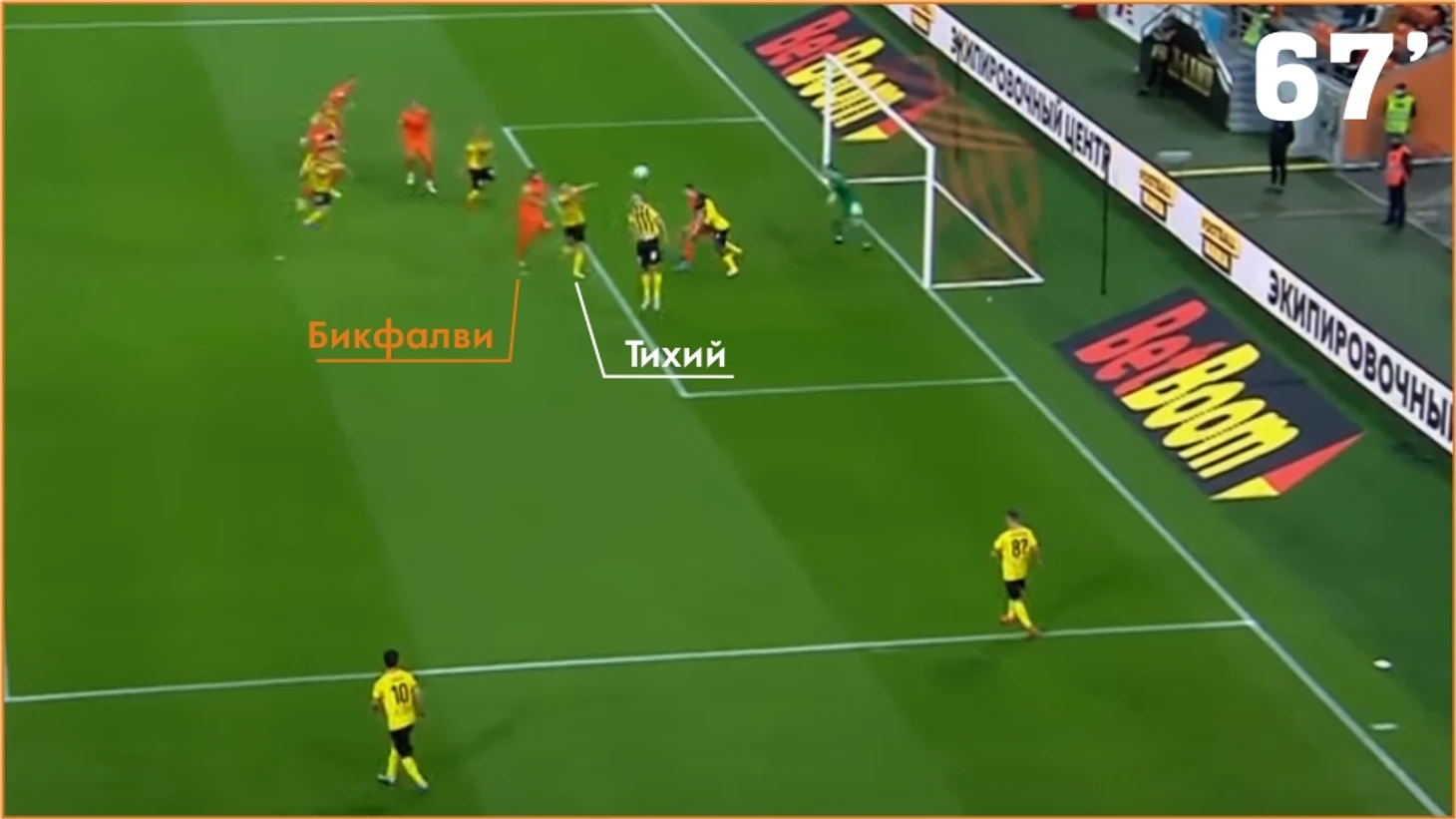 Видим, как перед подачей углового Тихий играет против Бикфалви.