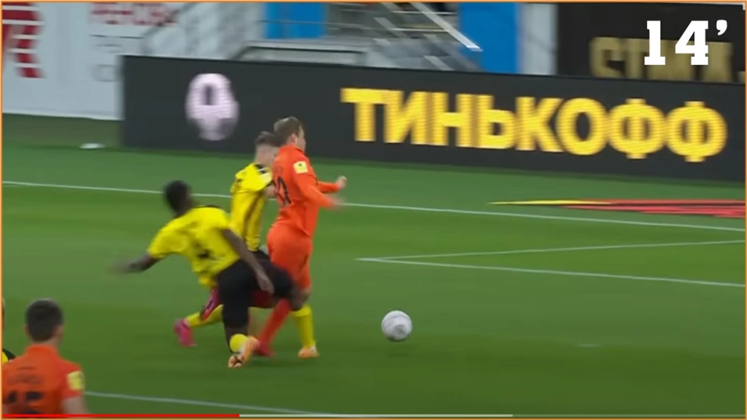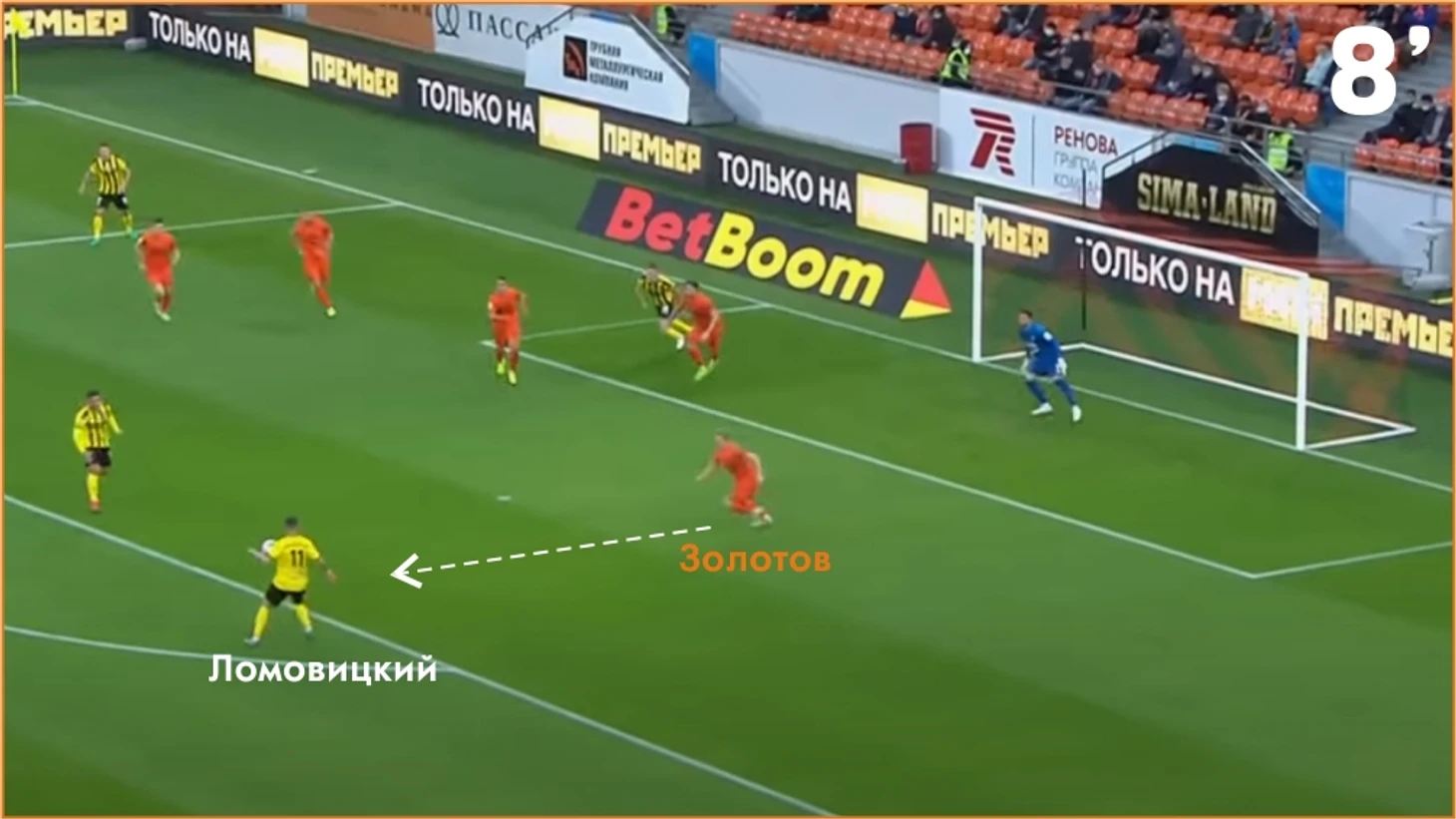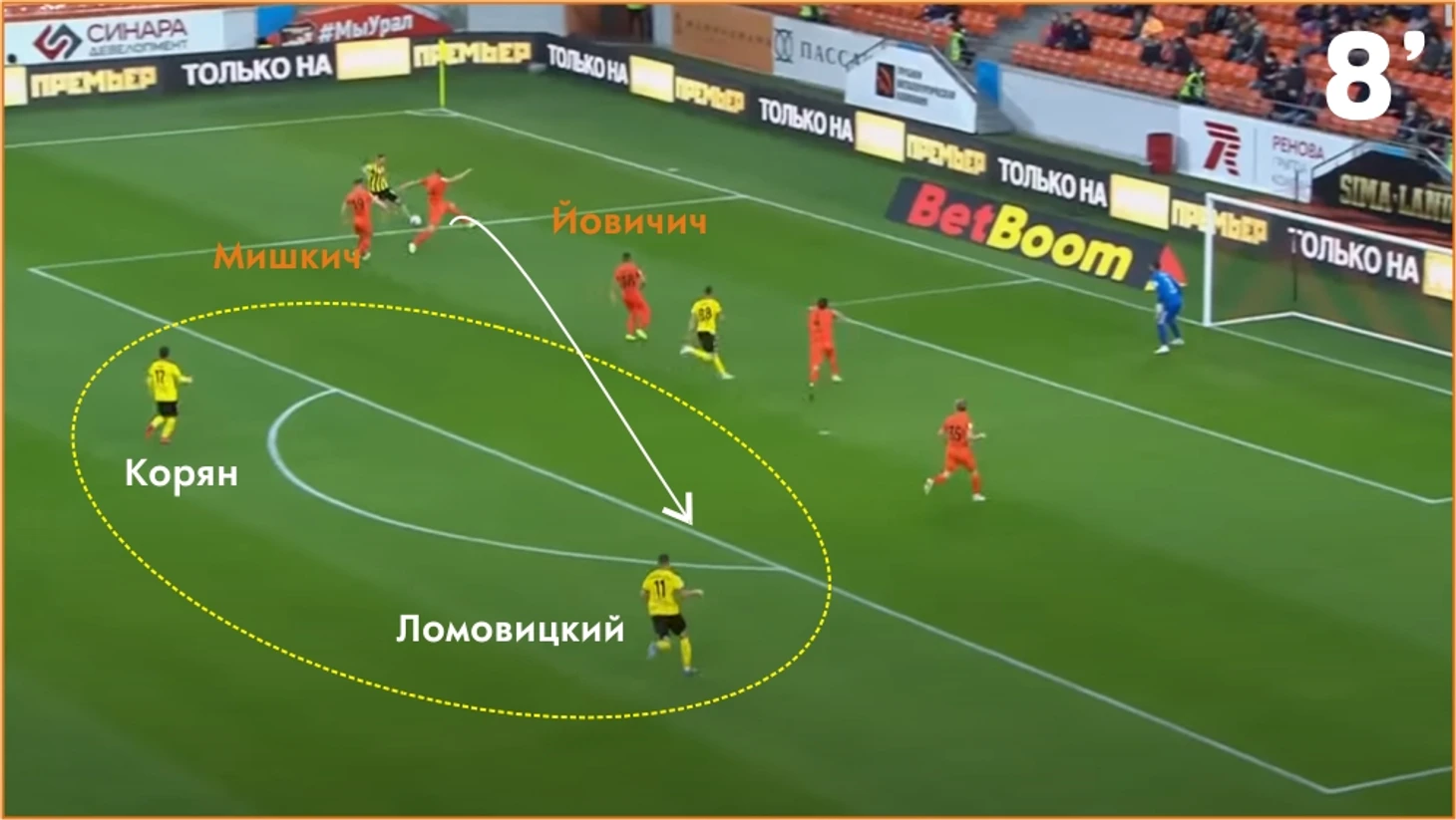 На 8-й минуте гости проводят, казалось бы, удачную атаку. На фланге игрок (судя по позиции, Полярус) отдаёт пас в центр на второй темп, создавая как будто бы голевой момент. Опорные полузащитники Мишкич и Йовичич в моменте оказались на линии с защитниками, а всё от того, что Рыков где-то застрял и не успевает. Кажется, будто Корян и Ломовицкий - а это не кто попало, а вроде как некогда игроки "Локомотива" и "Спартака" - сейчас заставят понервничать вратаря.