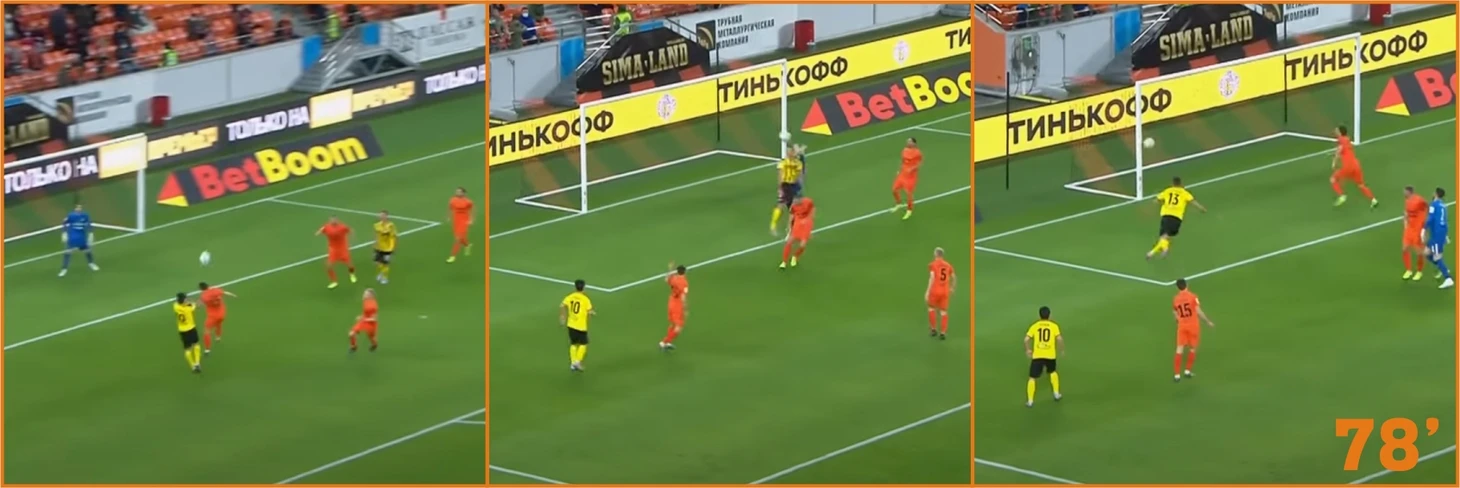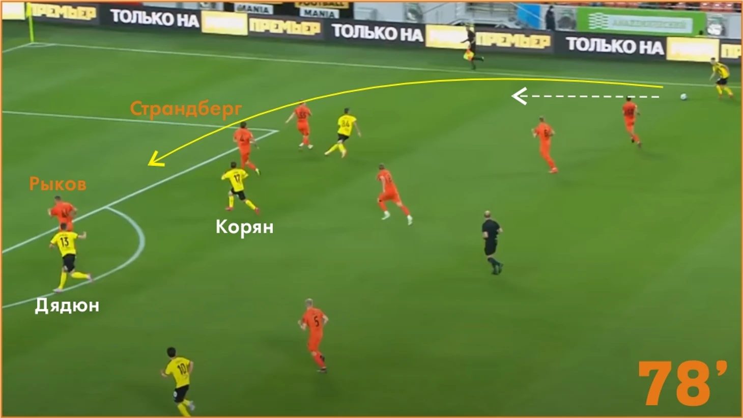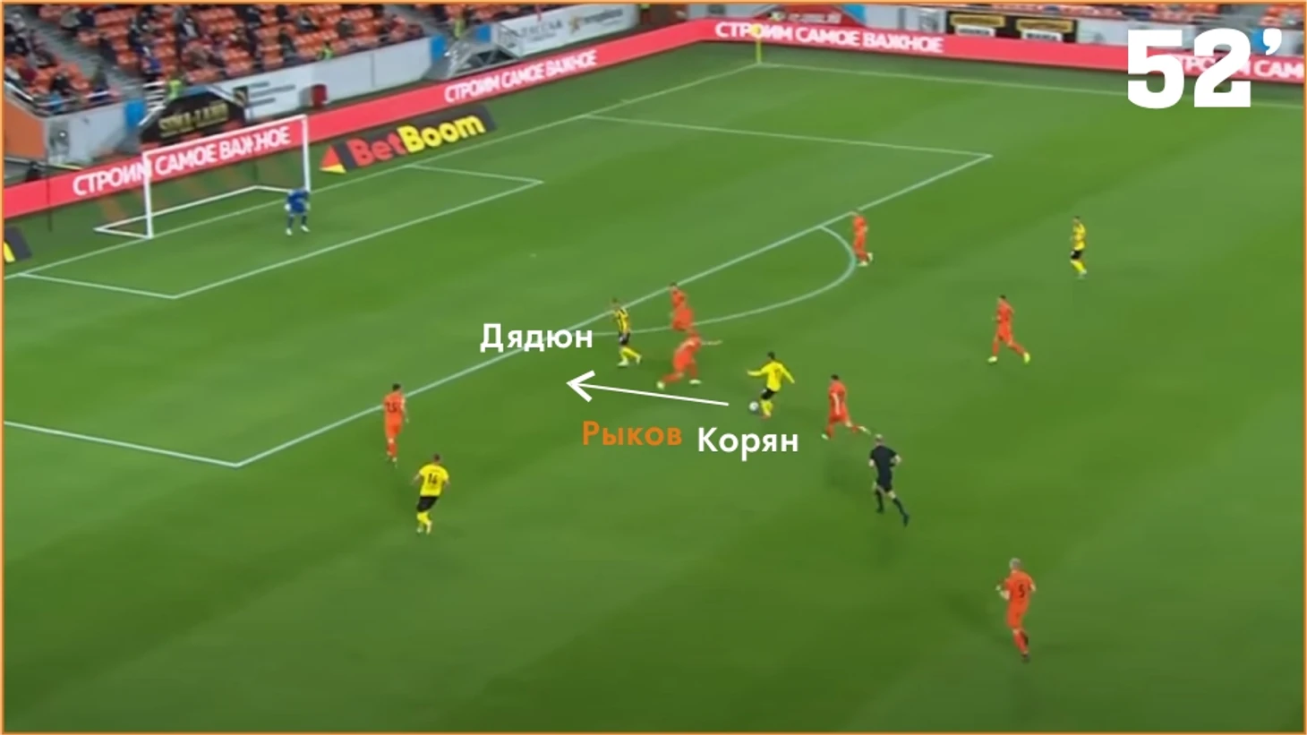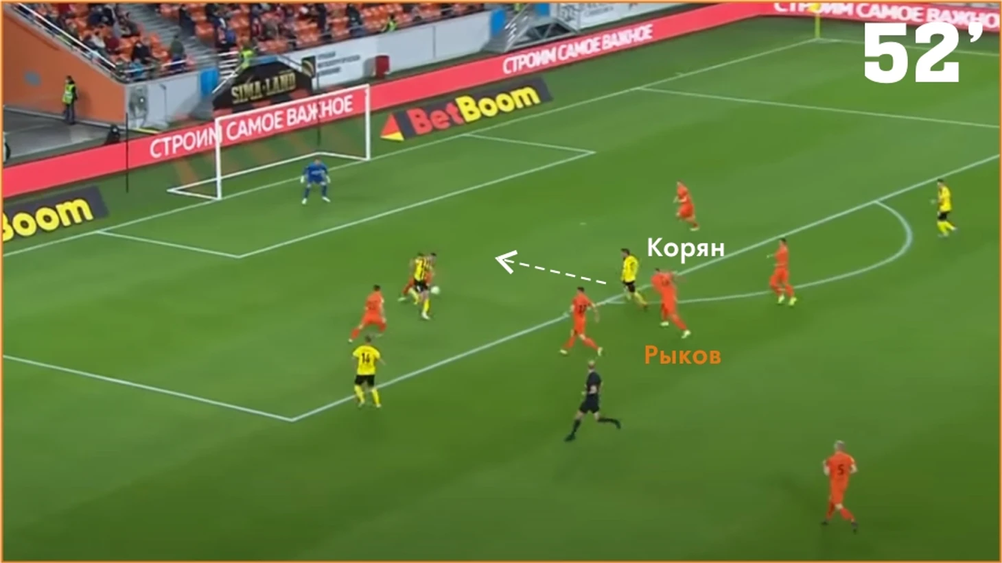 И вот последний шанс забить гол у гостей. Фланговый игрок готовится выполнить навес, и Корян с Дядюном отлично заняли позиции. Дядюн может выбежать из-за спины Рыкова, находясь вне поля зрения защитника, а Корян так вообще нашёл свободную зону в штрафной, куда и следовало делать заброс. Причём прямо в тот момент, который видно на кадре.