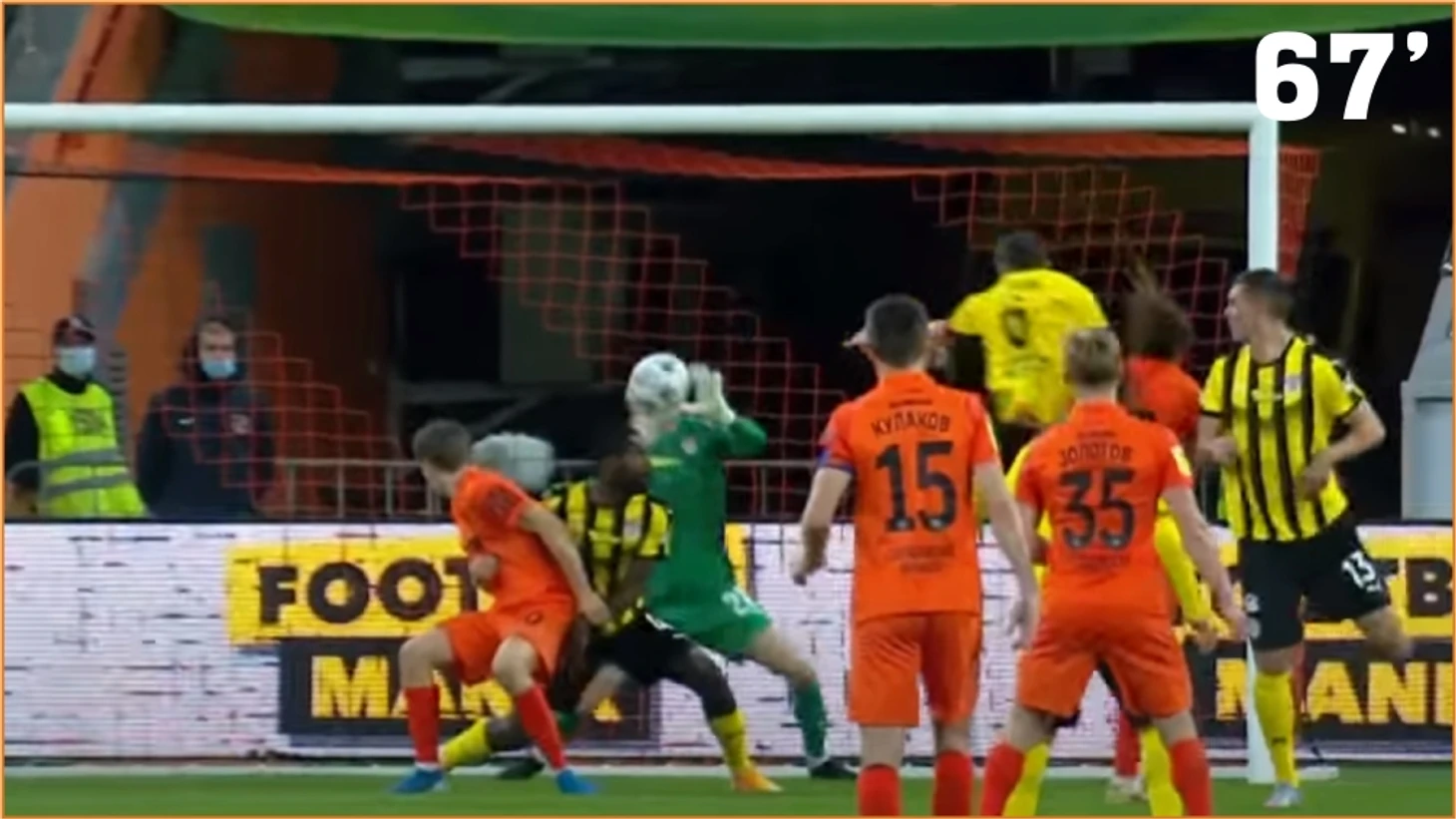 В итоге навес идёт на левого крайнего Камрана Алиева. В борьбе с защитником мяч отскакивает в сторону вратаря, и Помазун вступает в верховую борьбу с Дядюном, которую замечательно проигрывает. Мяч идёт в ворота и, строго говоря, это гол. Мяч попал в штангу, но ошибка Помазуна ужаснее от этого не становится.