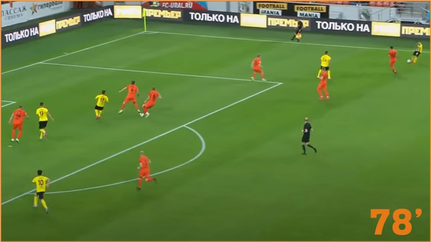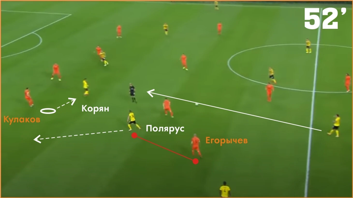 В начале второго тайма наблюдаем интересную атаку "Химок". Корян отходит в зону перед защитниками для получения мяча - видим, что пасом отрезано сразу несколько игроков "Урала". При этом Егорычев отпускает Поляруса, и на фланге обороны рискует оказаться атакующий футболист.