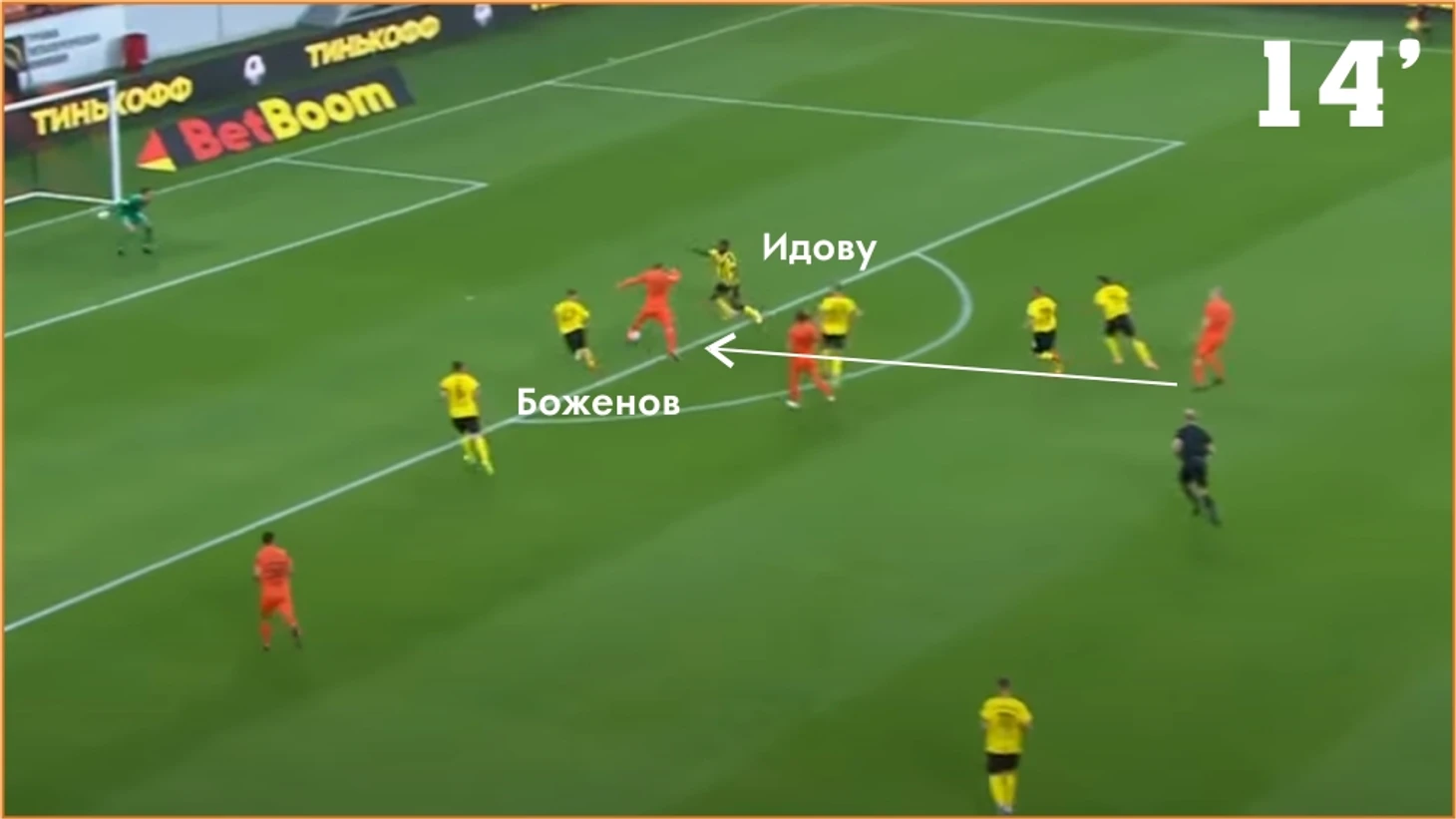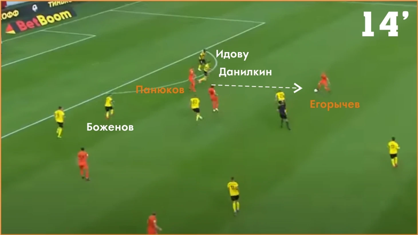 Мы видим, что правый полузащитник Егорычев сместился в центр. Против него должен играть левый защитник Идову, но ему неохота. Второй, кто должен играть против Егорычева - это Куат, который под №20 на кадре виден - он ближе всех к Егорычеву. Но и Куату ситуация не кажется достаточной для того, чтобы защищаться. Тогда Данилкин принимает разумное решение при безалаберности коллег - выдвигается на Егорычева, оставив за спиной Панюкова. С одной стороны Данилкин правильно всё делает, но с другой стороны его тут же должен страховать Идову, а тот явно это делать не собирается. Анализируя момент постфактум, можно сделать вывод о том, что Данилкин, конечно, поспешил, однако и ругать его тут надо в последнюю очередь.