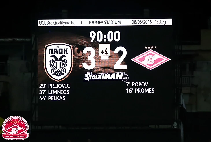 Начнем с Лиги чемпионов. Сезон 2018/2019. За 2.5 месяца до отставки триумфатора Массимо Карреры, «Спартак» боролся за попадание в групповой этап самого престижного турнира Старого Света. Поначалу в Салониках у москвичей получалось всё: усилиями Попова и Промеса «красно-белые» уверенно вели в счете 2:0.