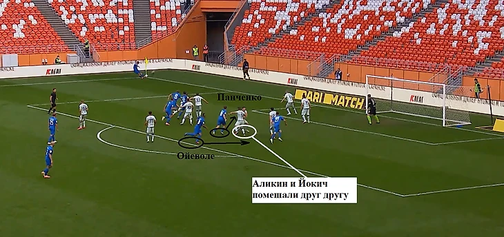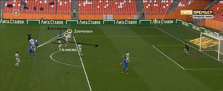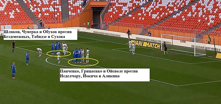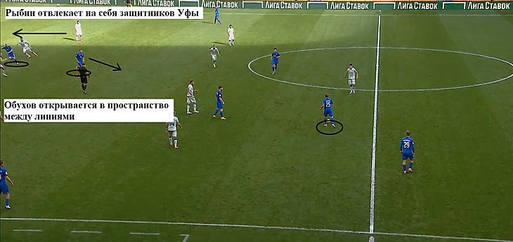 Если первая тройка в лице Шлякова, Чуперки и Обухова сделали обычный рывок к воротам, то во второй тройке Панченко использовал Ойеволе в качестве «заслона» для защитников Уфы. Сам Адесойе применил ложный рывок, тем самым окончательно запутав игроков обороны Вадима Евсеева.