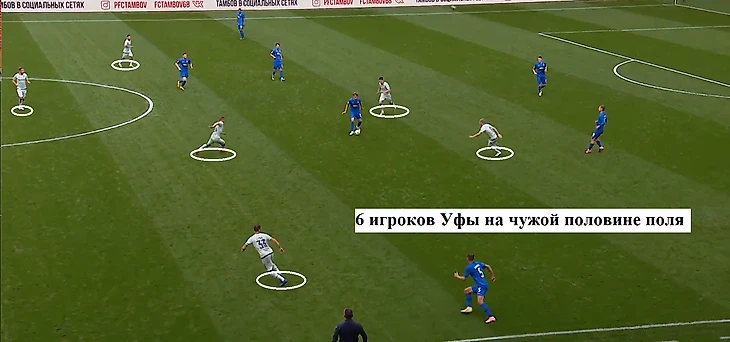 Этот прием в первой половине игры был реализован качественно, и футболисты гостей несколько раз отбирали мяч на чужой половине поля. Однако проблемы в создании ответной атаки не позволяли Уфе потревожить оборону Тамбова опасными моментами (за весь матч Уфа совершила 4 перехвата и 1 отбор на чужой половине поля (+2 потери мяча игроками Тамбова). В позиционной атаке Уфы принимали активное участие фланговые игроки. Алиев и Фольмер занимали позицию в полуфлангах, а на краях свободное пространство искали Сухов и Йокич.